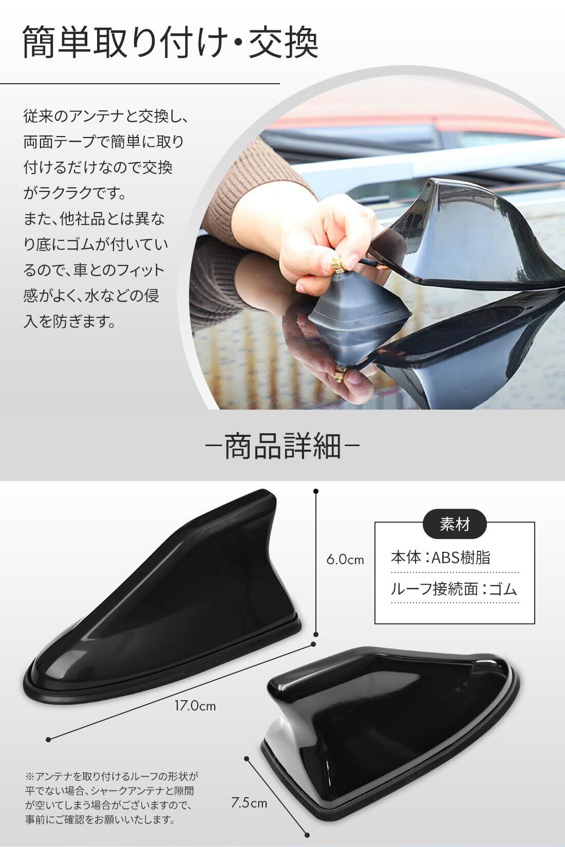 自動車 アンテナのサイズと素材:17cm x 7.5cm x 6cm・シャークアンテナ本体:ABS樹脂・ルーフ接続面:ゴム