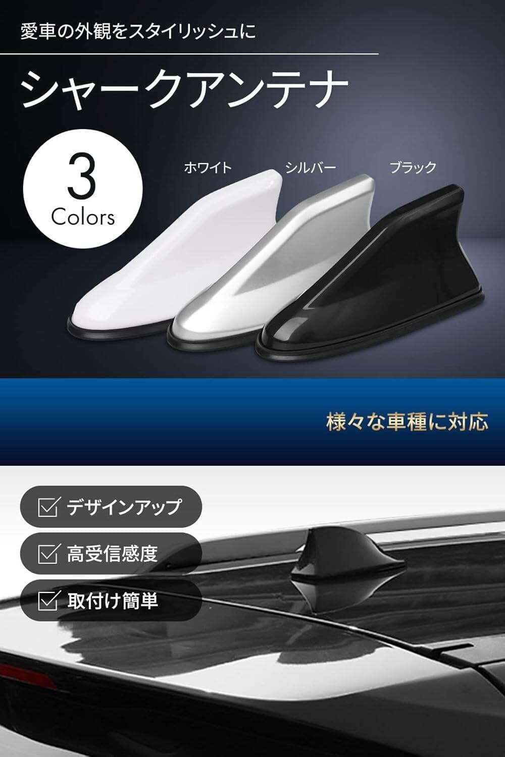 外観がスタイリッシュかつ高級感に:シャーク フィン アンテナは車のルーフに取り付けるタイプのアンテナで、その形状がサメのヒレに似ていることから「シャークアンテナ」または、「ドルフィンアンテナ」と呼ばれています。従来のアンテナよりもコンパクトでスタイリッシュなデザインなので、車の外観を損なうことなく取り付けることができ、 高級感のある印象にカスタムすることができます。また、複数のカラーバリエーションがあるため、車に合わせた色を選ぶことができますし、汎用品となりますので様々な車種でご利用いただけます。※汎用品とはなりますが、車種によっては合わない場合もございます。必ず穴のサイズなどをご確認ください。また、アンテナを取り付けるルーフの形状が、平でない場合シャークアンテナと隙間が空いてしまう場合がございます。