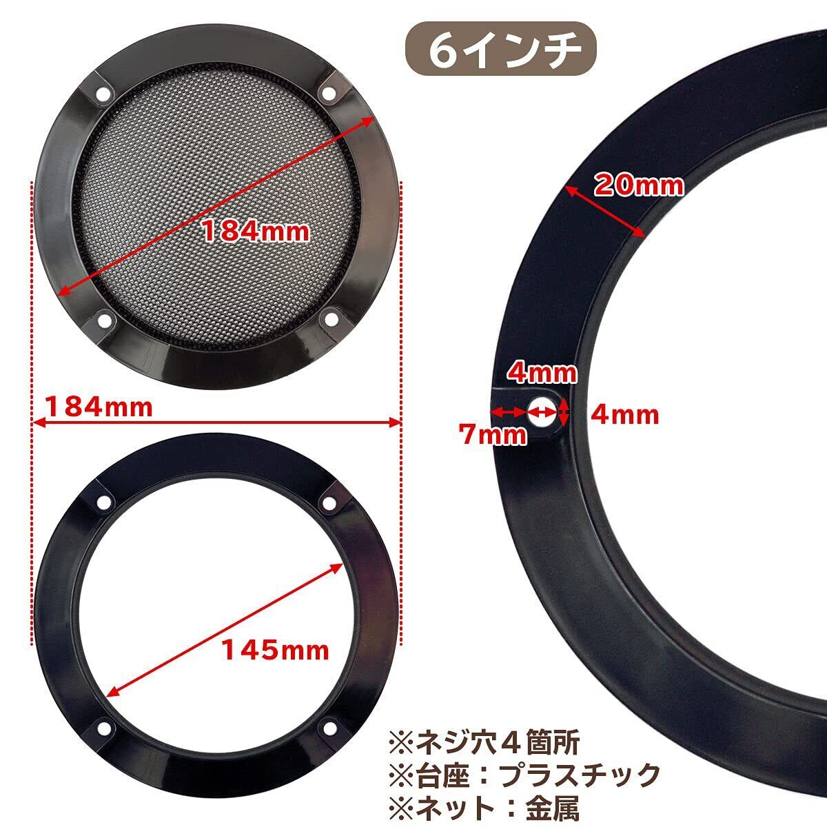 素材はメッシュ部分がスチール製、グリル枠が樹脂製で、耐久性と美観を兼ね備えています。サイズは2インチから9.5インチまで揃っており、各種スピーカーユニットに適合します。