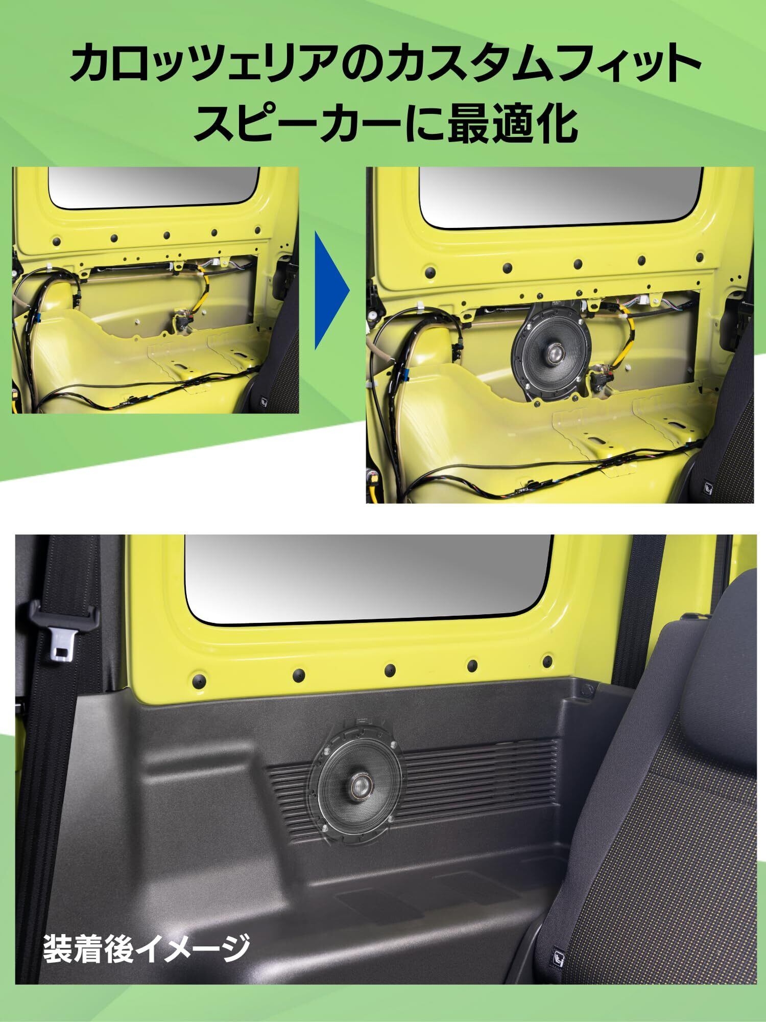 カスタムフィットスピーカー(16cm)用 後席側面への確実な取付けを可能にする、ジムニー専用設計のリアスピーカー取付キット(遮音クッション同梱)