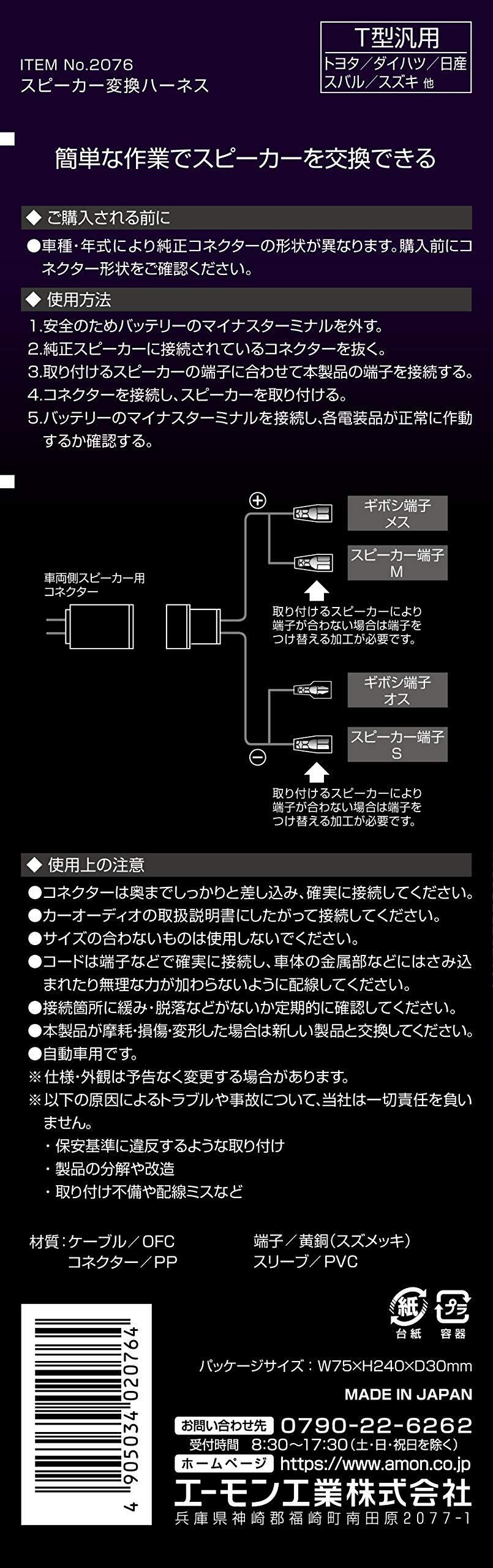 エーモン(amon) AODEA(オーディア) スピーカー変換ハーネス T型汎用 スピーカーの交換時に 2076
