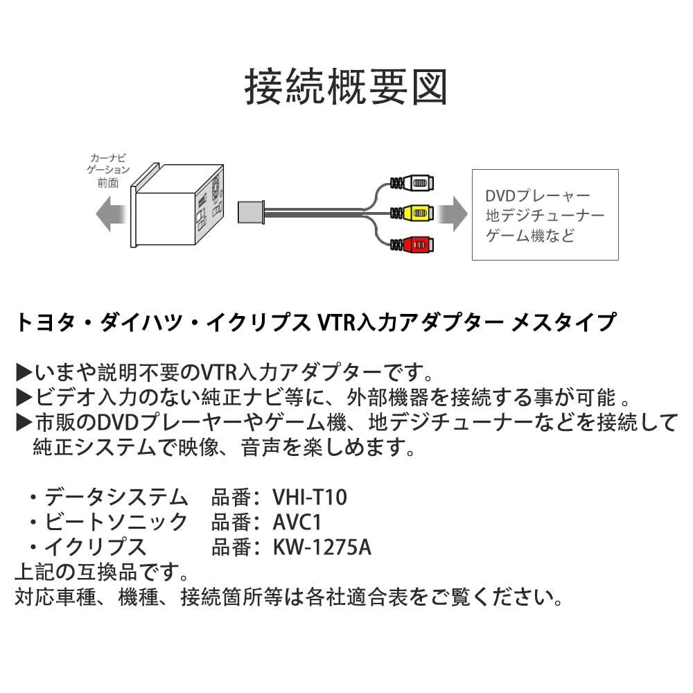 【適合車種/対応ナビ】・データシステム 品番:VHI-T10 ・ビートソニック 品番:AVC1 ・イクリプス 品番:KW-1275A 上記の互換品です。 対応車種、機種、接続箇所等は各社適合表をご覧ください。