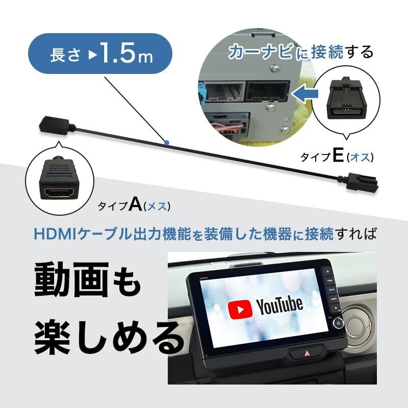こちらのケーブルは、カーナビ用のHDMI2.0 タイプE端子をHDMIタイプA端子に変換するケーブルです。〇HDMI変換ケーブルの長さは1.5mでグローブボックスなどにも届きます。〇社名刻印付きのオリジナル変換ケーブルです。〇適合情報:カーナビ側のHDMI入力端子の形状はお使いのカーナビによって異なります。こちらのHDMI変換ケーブルは、ご使用のカーナビ側のHDMI入力端子が「タイプE」であれば、殆どの純正カーナビに接続可能です。