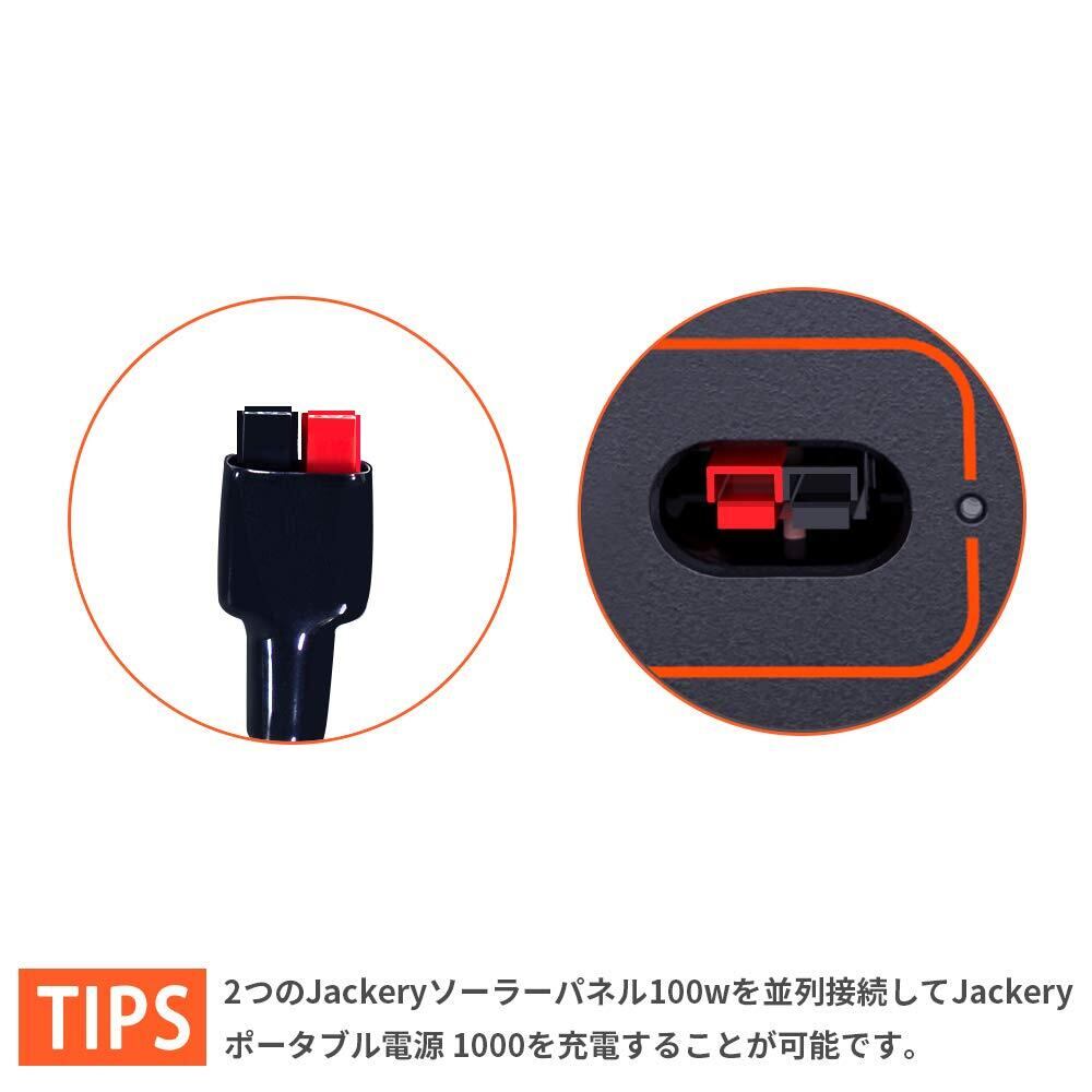 【Jackeryポータブル電源1000専用ケーブル】2つのJackeryソーラーパネル100wを並列接続してJackeryポータブル電源 1000を充電することが可能です。約8時間で満充電が可能です。また、ポータブル電源1000は同型番のSolarSagaのみ並列接続可能です。
