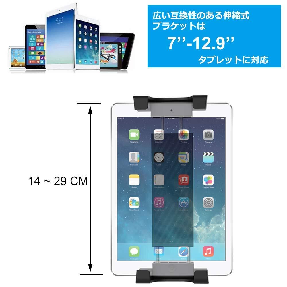 対応機種:14〜29cmの伸縮可能なサイズのタブレットブラケットは全ての7-12.9インチタブレットに向け。例えば:iPad Pro 12.9 11 10.5, iPad Air 5 4 3 2 1, iPad mini 5 4 3 2 1, Samsung Galaxy Tabsなど