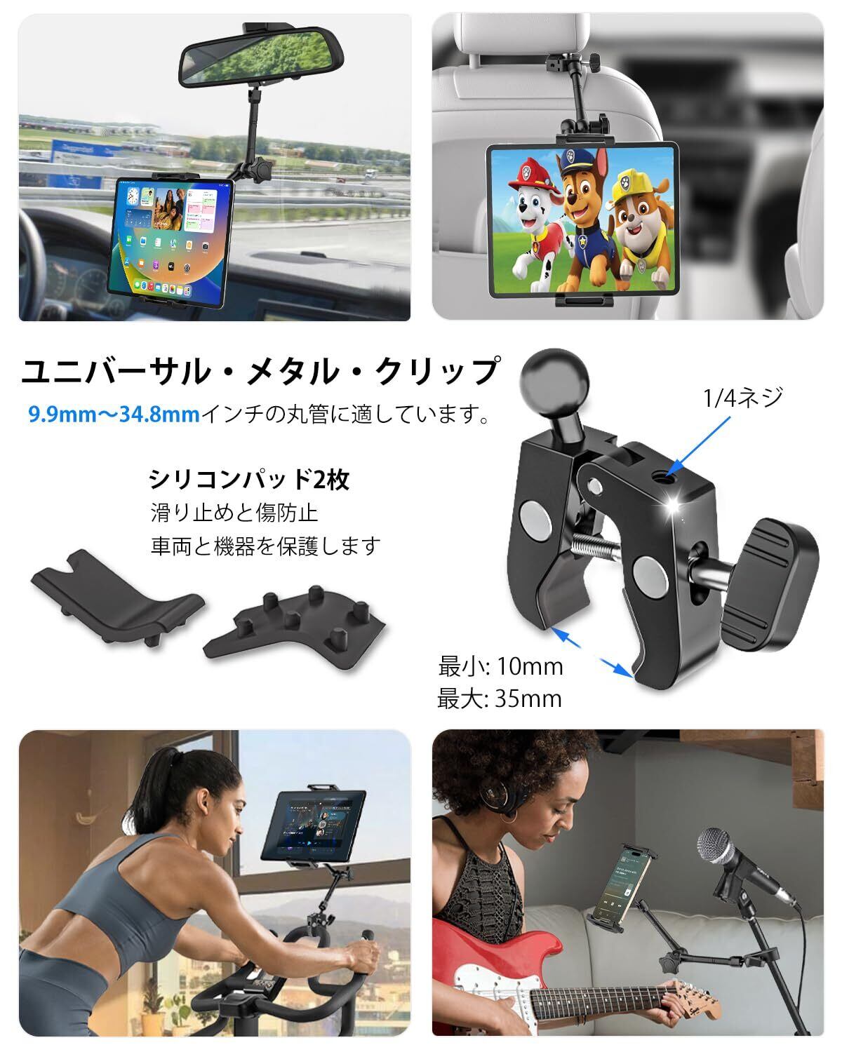 【ユニバーサル金属クリップ】タブレット 車載ホルダーのメタルクリップには、滑り止めと傷防止のシリコンパッドが装備されており、車両や機器を効果的に保護します。バックミラー、ヘッドレスト、フィットネスバイク、マイクスタンドなどに幅広く対応。丸型チューブ。
