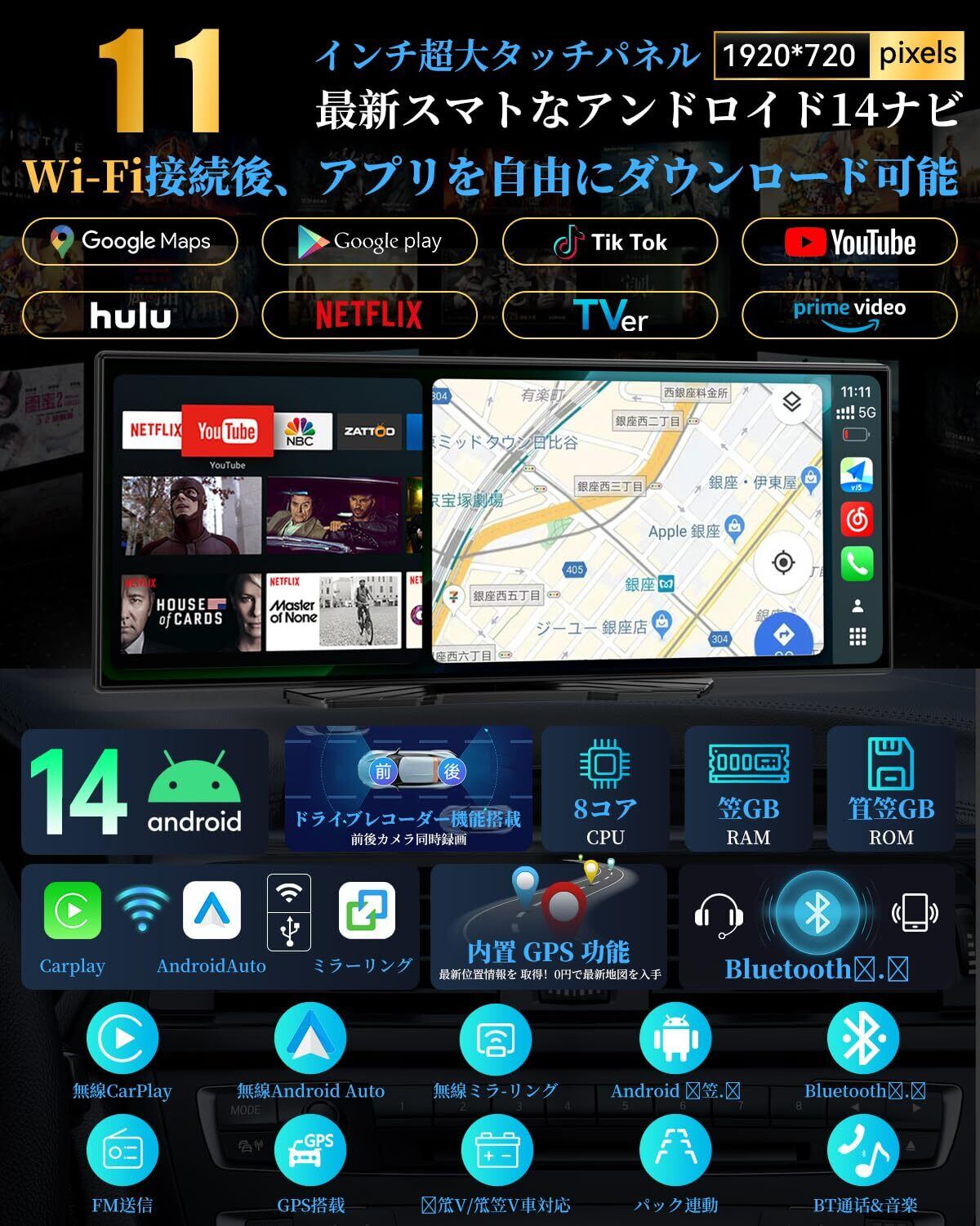 2026最新 ナビ・Carplay・ドライブレコーダーの1台3役 VANBAR ディスプレイオーディオ 11インチ YouTubeやNetflixなどが動画視聴できる カープレイ Android Auto WiFi ワイヤレスミラーリング 自動明るさ調整 1920*720 技適取得済み