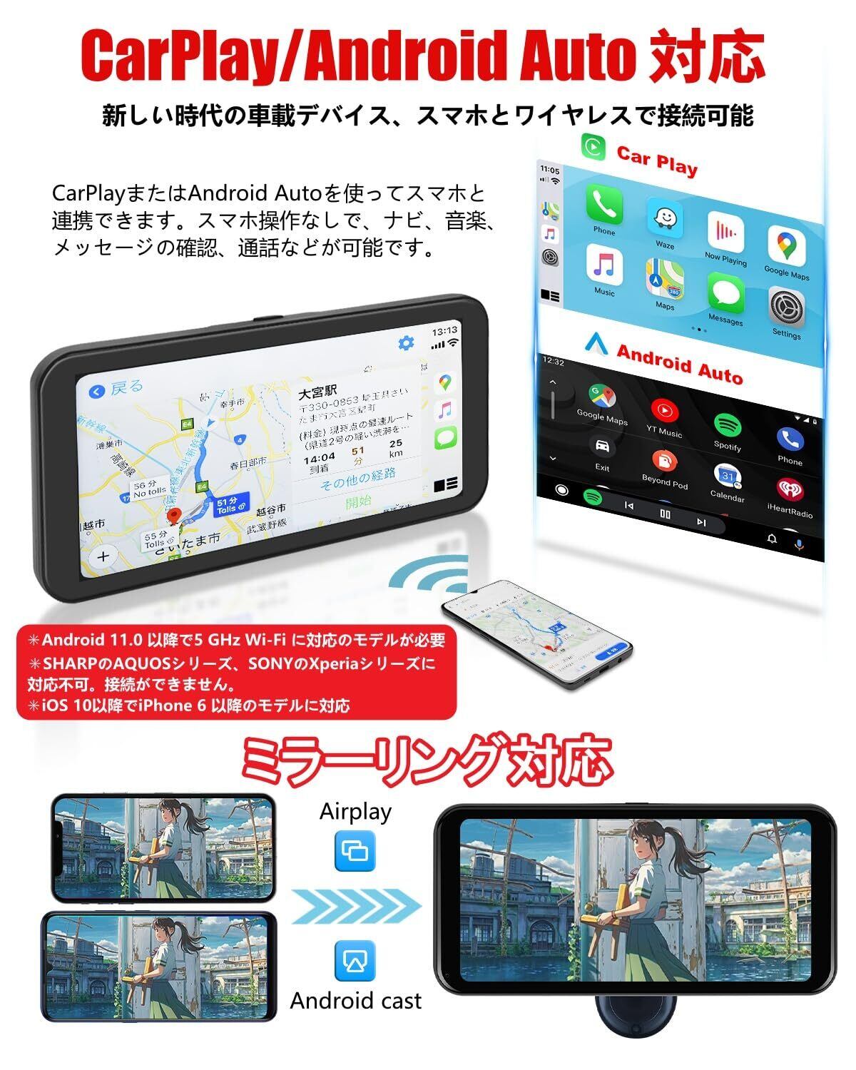 【高速ワイヤレス接続でCarPlay/Android Auto対応】ワイヤレスでCarPlayおよびAndroid Autoに対応しており、スマートフォンとの接続が簡単で迅速。わずか21秒で接続が完了し、短時間の停車後でも自動で接続され、以前の画面に戻ります。これにより、車に乗り込んでからすぐにナビゲーションや音楽、メッセージなどを安全に利用できます。さらに、AirPlayやAndroid Castによる画面ミラーリング機能も搭載しており、スマホの画面をディスプレイに映し出すことができ、便利なドライブ体験をサポートします。車内での操作がもっと快適に、もっと安全に!