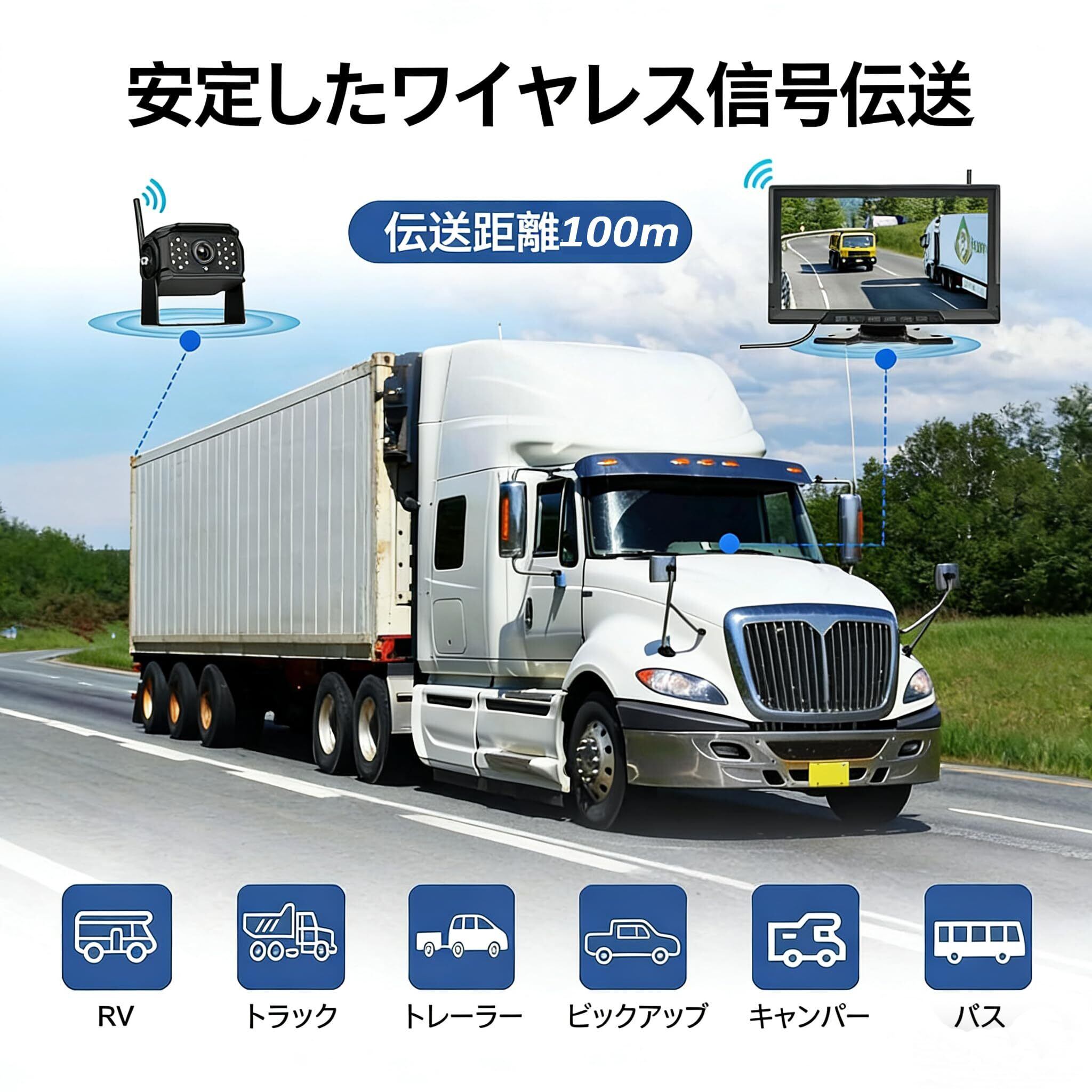 【大型車両専用設計 12-36V広電圧対応】 24v バックカメラシステムとしてトラック・バス・キャンピングカーなど大型車両に最適。金属+プラスチック複合材質で振動や衝撃に強い。ワイヤレスアンテナ増幅機能で車体の金属干渉を軽減。