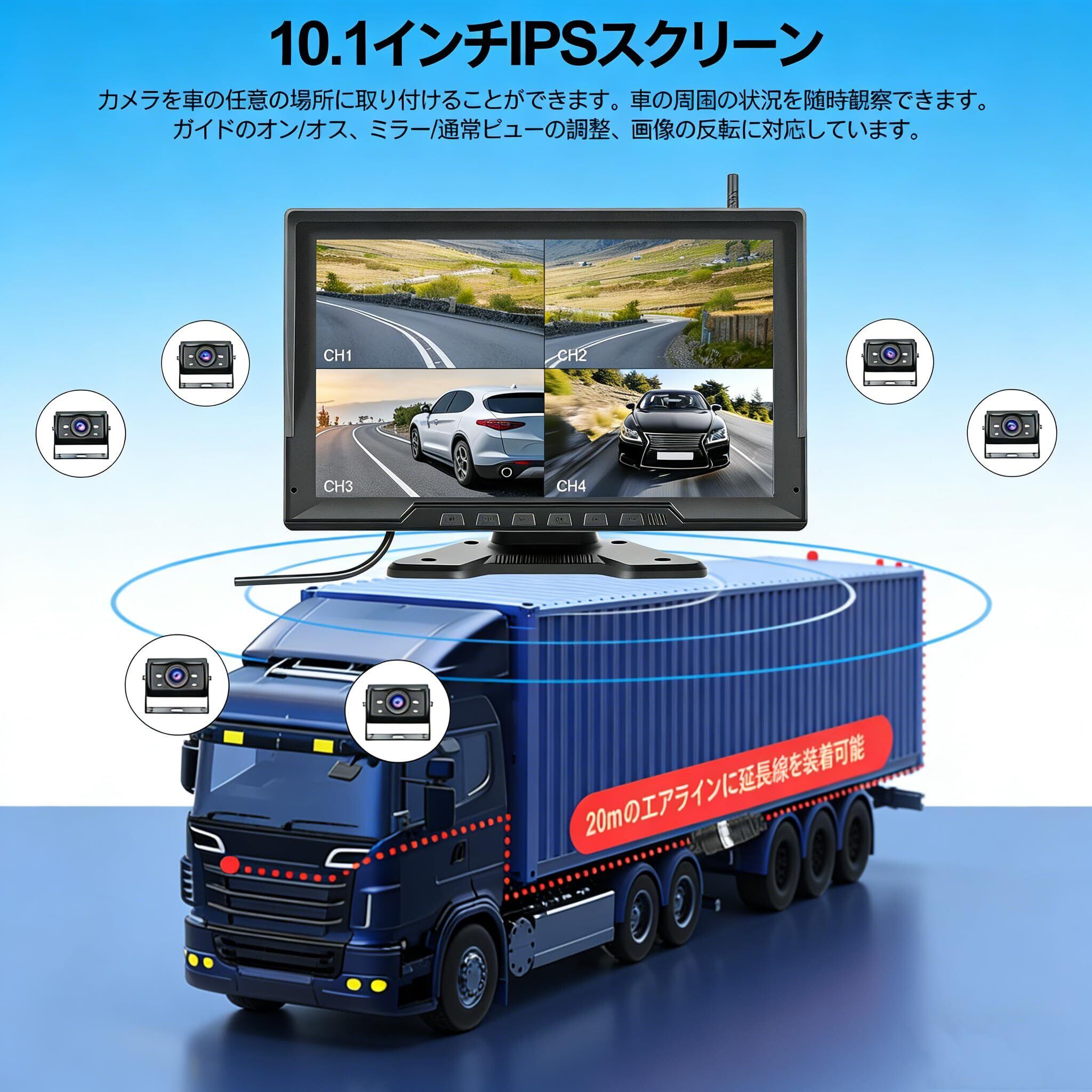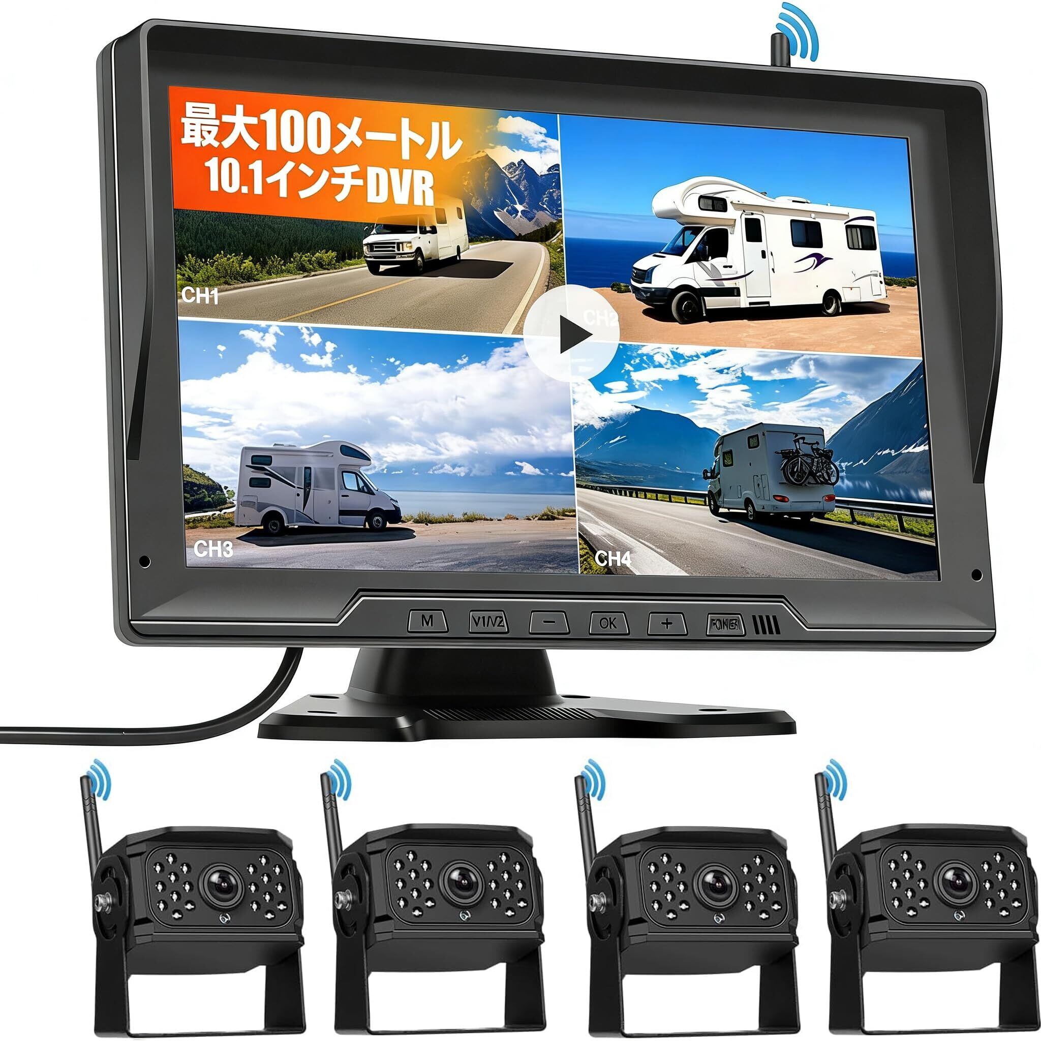 ワイヤレスバックカメラキット、10.1インチHD 4画面分割オンダッシュモニター 録画機能付き、駐車監視機能付き、IP68防水ナイトビジョンバックカメラ、12-36V兼用 4個カメラ付きセット(キャラバン/バス/トレーラー/トラック用)