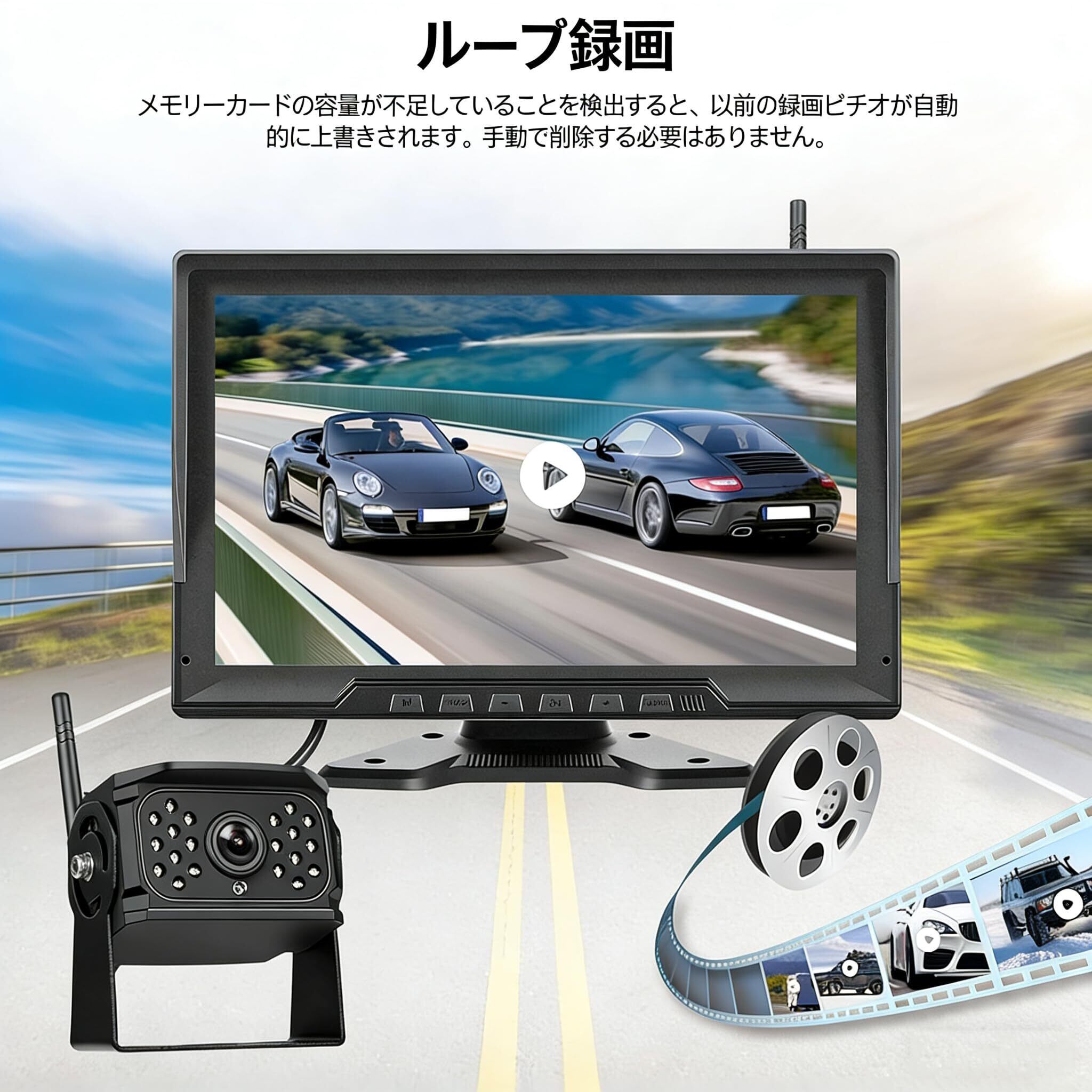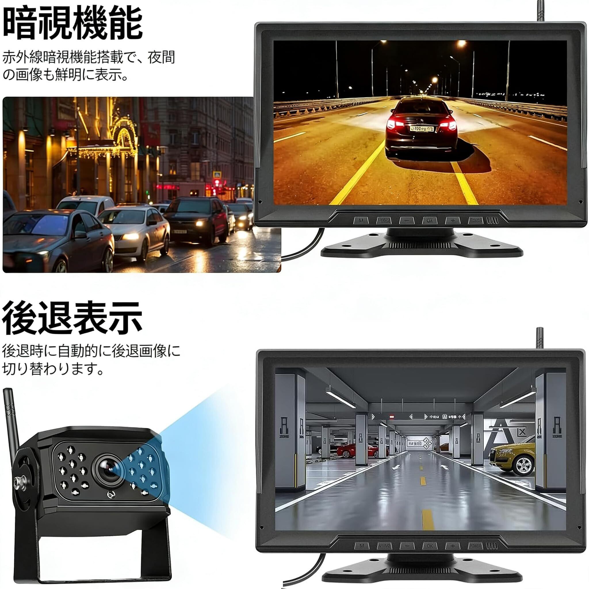 【バックカメラモニターセット 最新ワイヤレス技術】 従来品比抗干扰性能50%向上のデジタル無線伝送システムを採用。IP68完全防水構造で梅雨や豪雪など日本の気候に対応。10.1インチIPS広視野角パネル(解像度1024X600)により、暗い駐車場でも鮮明な映像を表示。バックモニター 後付け工事不要で、電源接続するだけの簡単設置。
