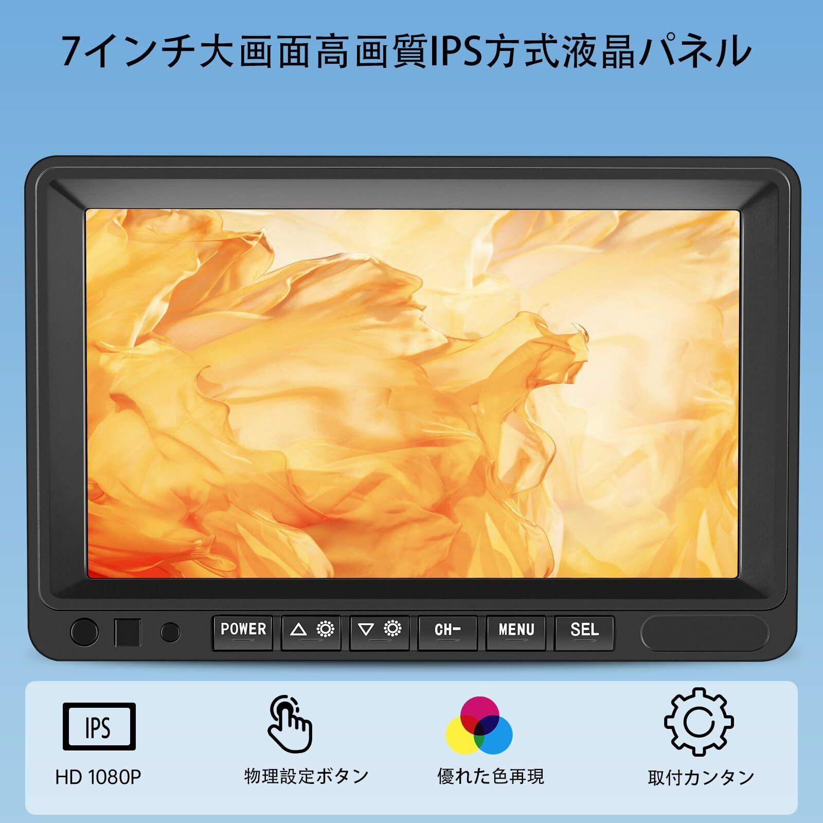 【視認性抜群の7インチ広視野角IPS液晶】7インチ1024*600バックモニターはIPS方式液晶パネルを採用し、従来のTN方式パネルと比べて視野角が広く、色再現性に優れています。カーモニターはIPS材質画面を採用から、ドライバーの座る位置や姿勢に関係なく、どんな角度から車リアモニターの画像を見る時はっきりと見えます、鮮やかな色彩表現とコントラストを実現します。太陽光が強い日中でも画面が見やすい防眩コーティングを施しています。