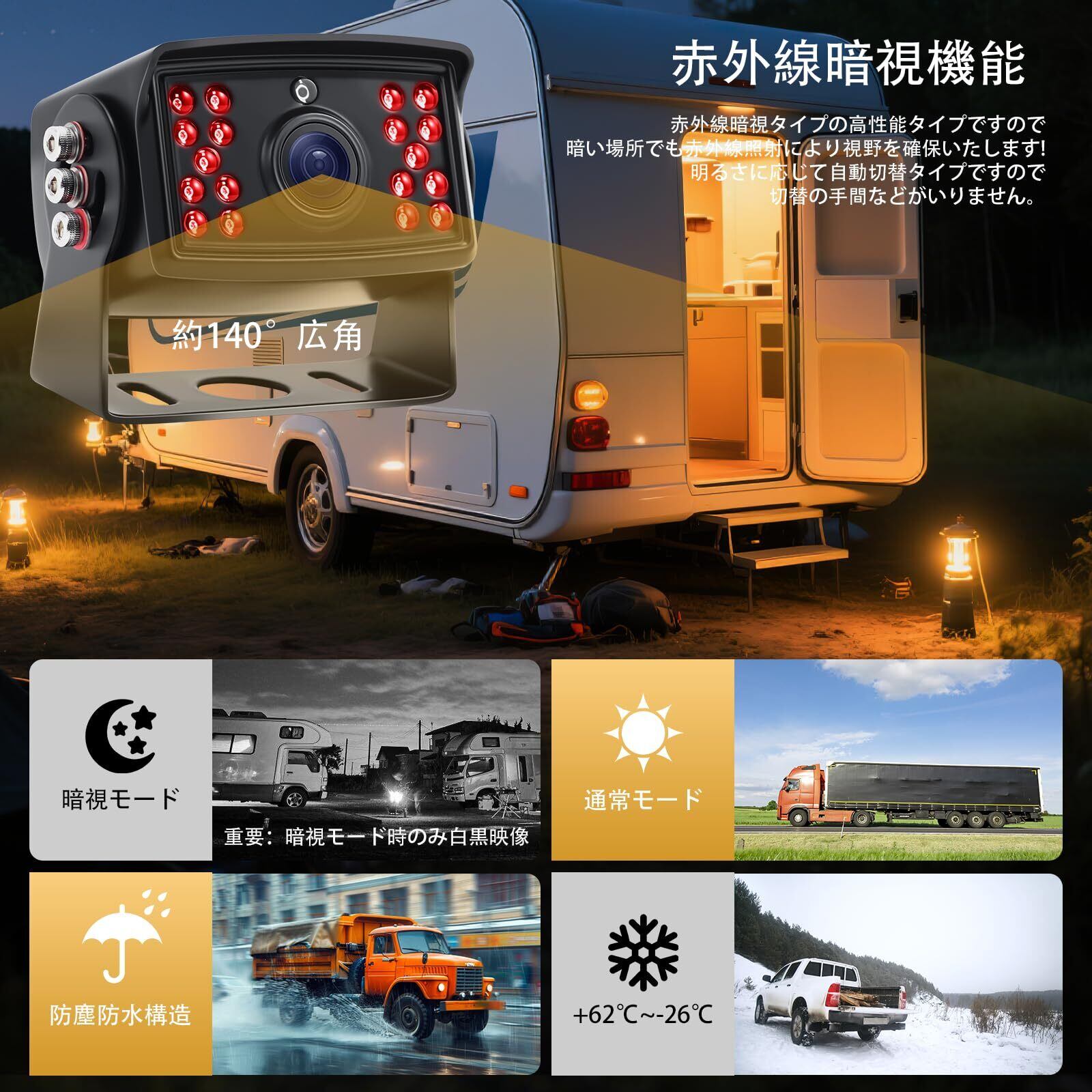 ️【過酷な環境に耐える高品質防水防塵カメラ】防塵防水構造のワイヤレスバックカメラなので、大雨や砂塵の多い環境下でも確実に動作します。自動調光機能付き高輝度LEDライトにより、夜間やトンネル内などの暗い場所でも後方の状況をしっかり確認可能です。LEDライトは周囲の明るさに応じて自動的にオン/オフを切り替えるため、手動での操作は不要。-26℃~62℃の広い温度範囲で安定動作し、北海道から沖縄まで日本全国にも対応しています。