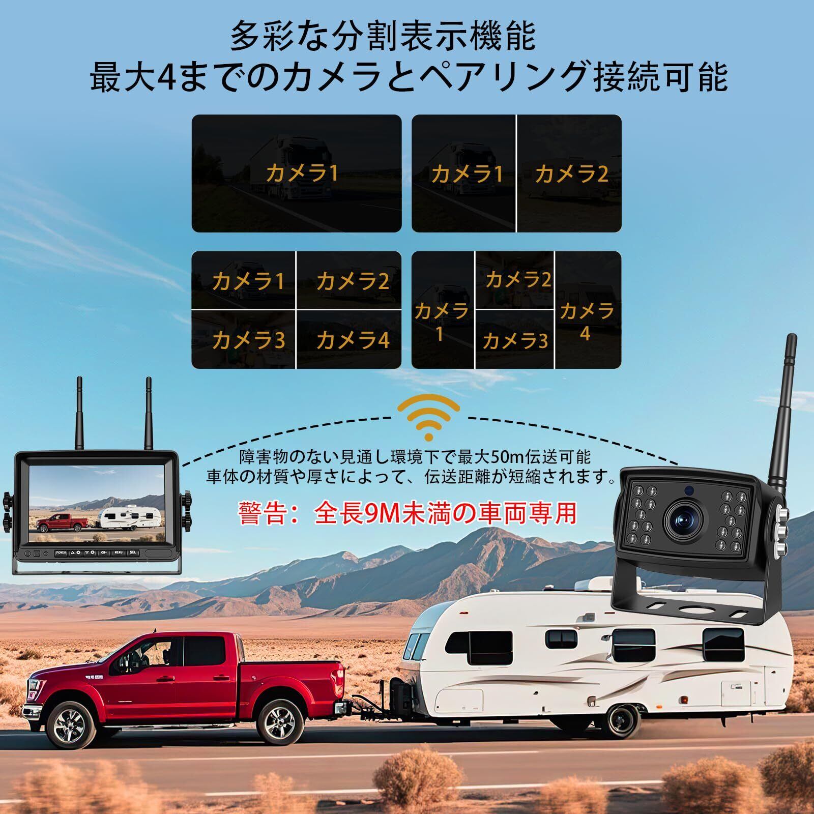️【多様な画面表示機能に対応する】本品は正像/鏡像の切り替えに加え、「上下左右反転」機能を追加します。また、最大4台のカメラを同時接続可能で、モニター画面を2分割/3分割/4分割で表示できます。「荷台の状況も確認したい」「右側面の見えにくさが気になる」といったお悩みを一気に解決します。車両周囲の全方位を確認できるため、車線変更時の安全確認や荷物の積み下ろし時、駐車場での狭いスペースへの進入時に威力を発揮します。※標準パッケージにはカメラ1台が含まれます。追加カメラは別途ご購入ください。