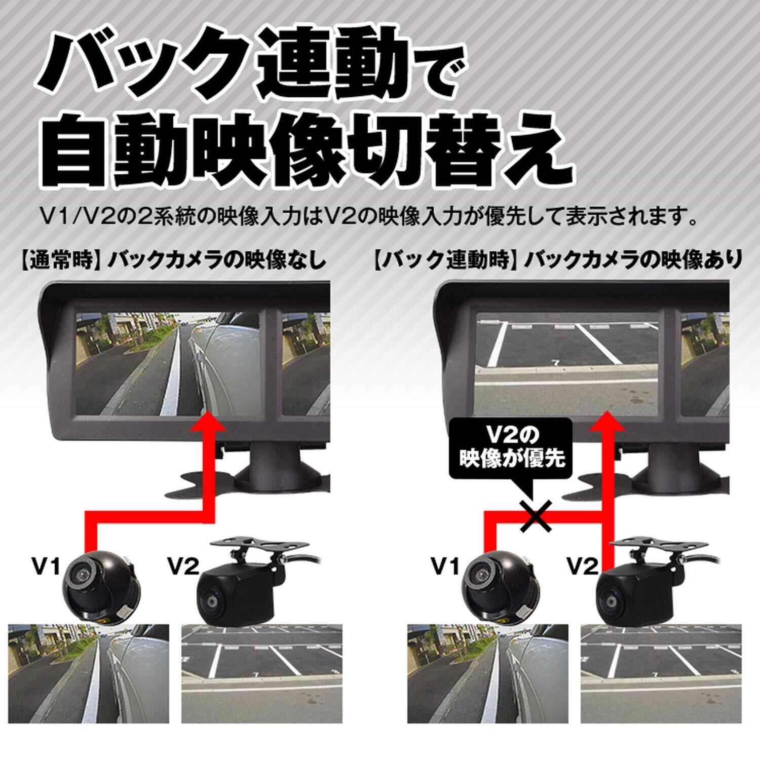 【バック連動で自動映像切替え】 V1/V2の2系統の映像入力はV2の映像入力が優先して表示。バック連動されたバックカメラに接続しておけば バック時に自動的にバックカメラの映像に切り替わる。