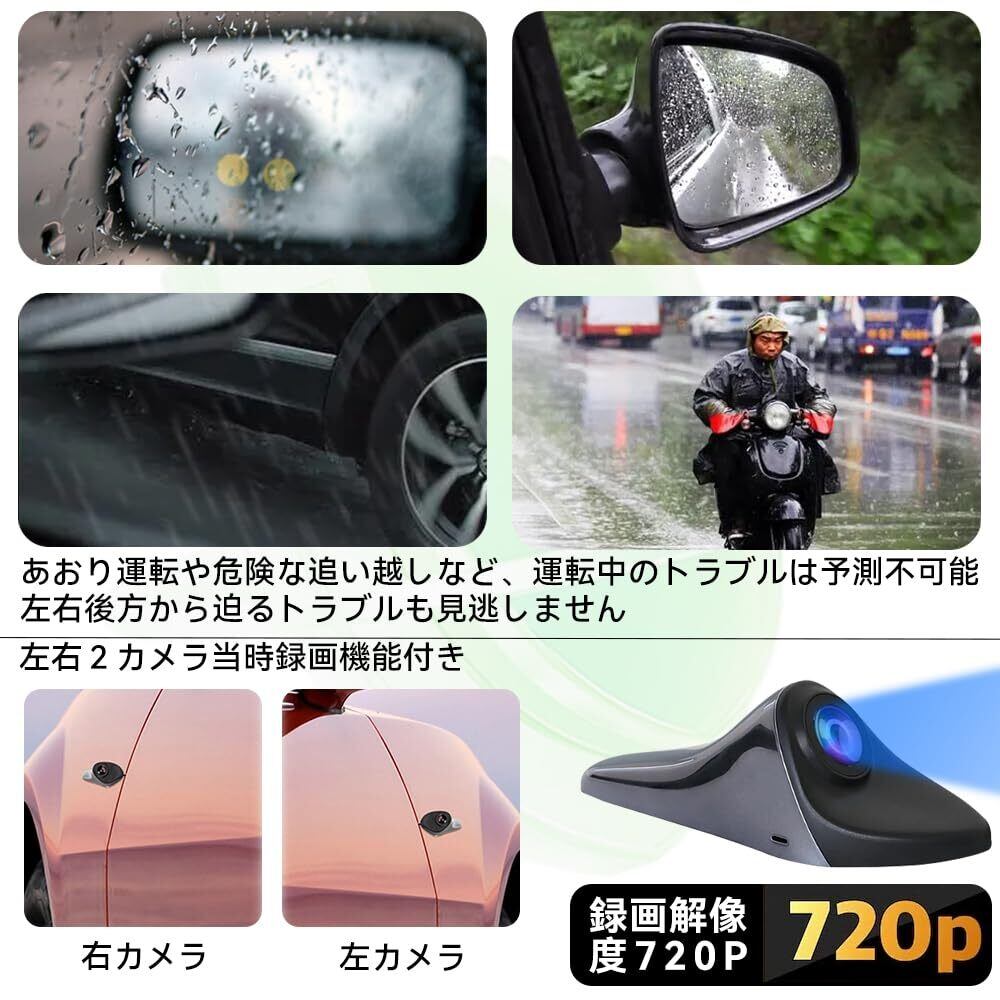 【サイドカメラシステム 左右2カメラ同時録画&録音機能付き 】録画解像度:720P あおり運転や危険な追い越しなど、運転中のトラブルは予測不可能。サイドビューカメラで同時録画対応するので、左右後方から迫るトラブルも見逃しません。イグニッションキーONからOFFまでの映像をmicroSDカードに常時録画し、microSDカードの録画フォルダの容量がいっぱいになると古いデータから上書きして録画を続けます。
