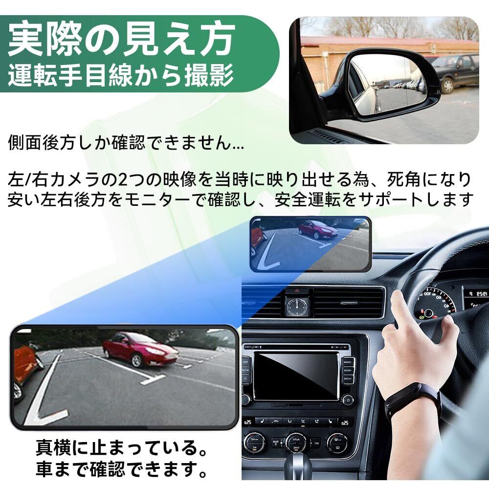 【左折・右折・巻き込み等の死角をカバーするサイドカメラシステム】 左/右カメラの2つの映像を同時に映し出せる為、死角になりやすい左右後方をモニターで確認し安全運転をサポートします。