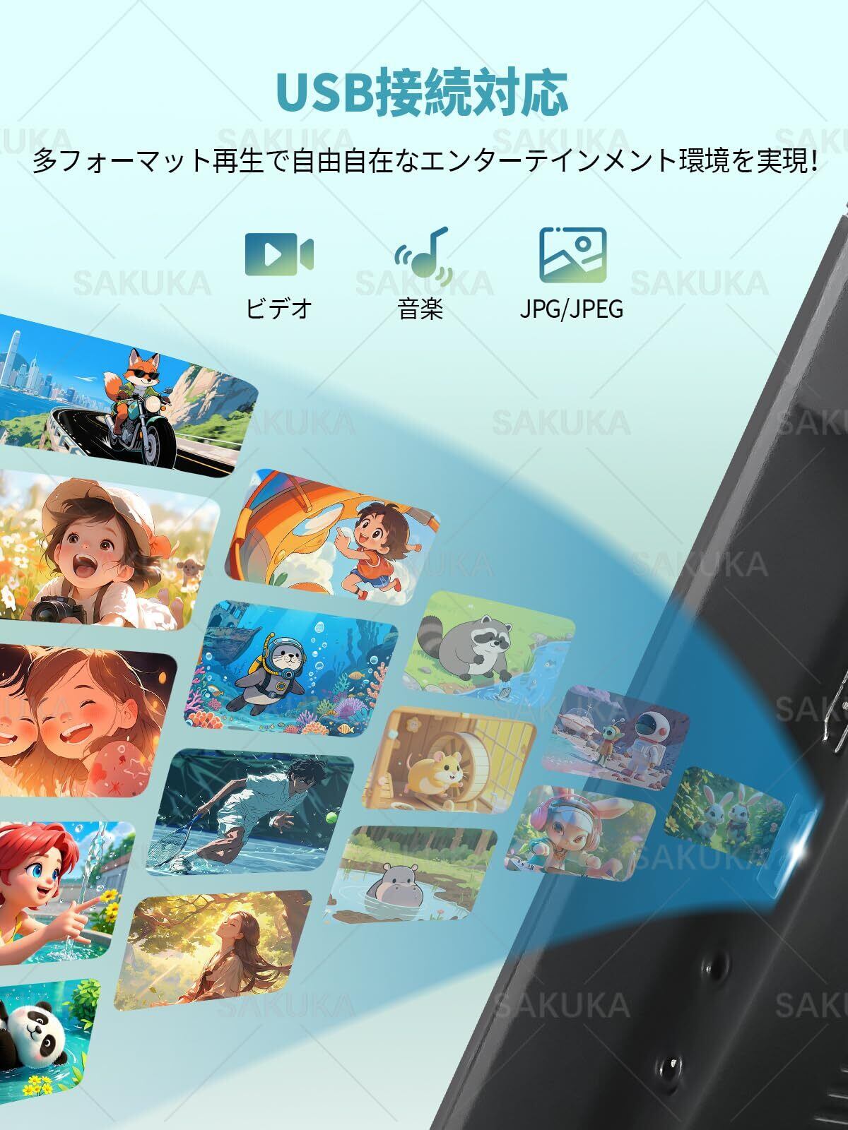 【多様な入力に対応したマルチファンクション】■ HDMI/USB/RCA 入力対応・HDMI 接続でスマホ、ゲーム機(PS5/Xbox)、ドローンなどの映像をリアルタイム表示(※出力機器の HDMI 対応を確認の上ご使用ください)。・USB メモリー(最大 32GB)から MP4/JPEG 等のファイルを直接再生。・別売り RCA ケーブルでデジタルチューナーやビデオカメラの映像入力も可能。■ 内蔵ステレオスピーカークリアーな 2ch サウンドで、音楽・映画・ゲームの臨場感を高めます。