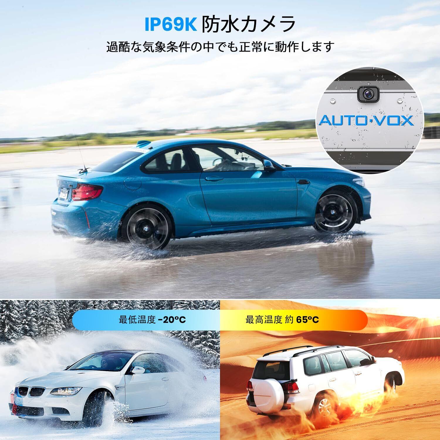 【IP69K 防水カメラ】ワイヤレス バックモニターは IP69K 防水仕様で、水しぶきや高圧洗浄にも耐え、-20℃~65℃の極限温度でも安定動作します。激しい雨や洗車時でも確実に画像を提供します。