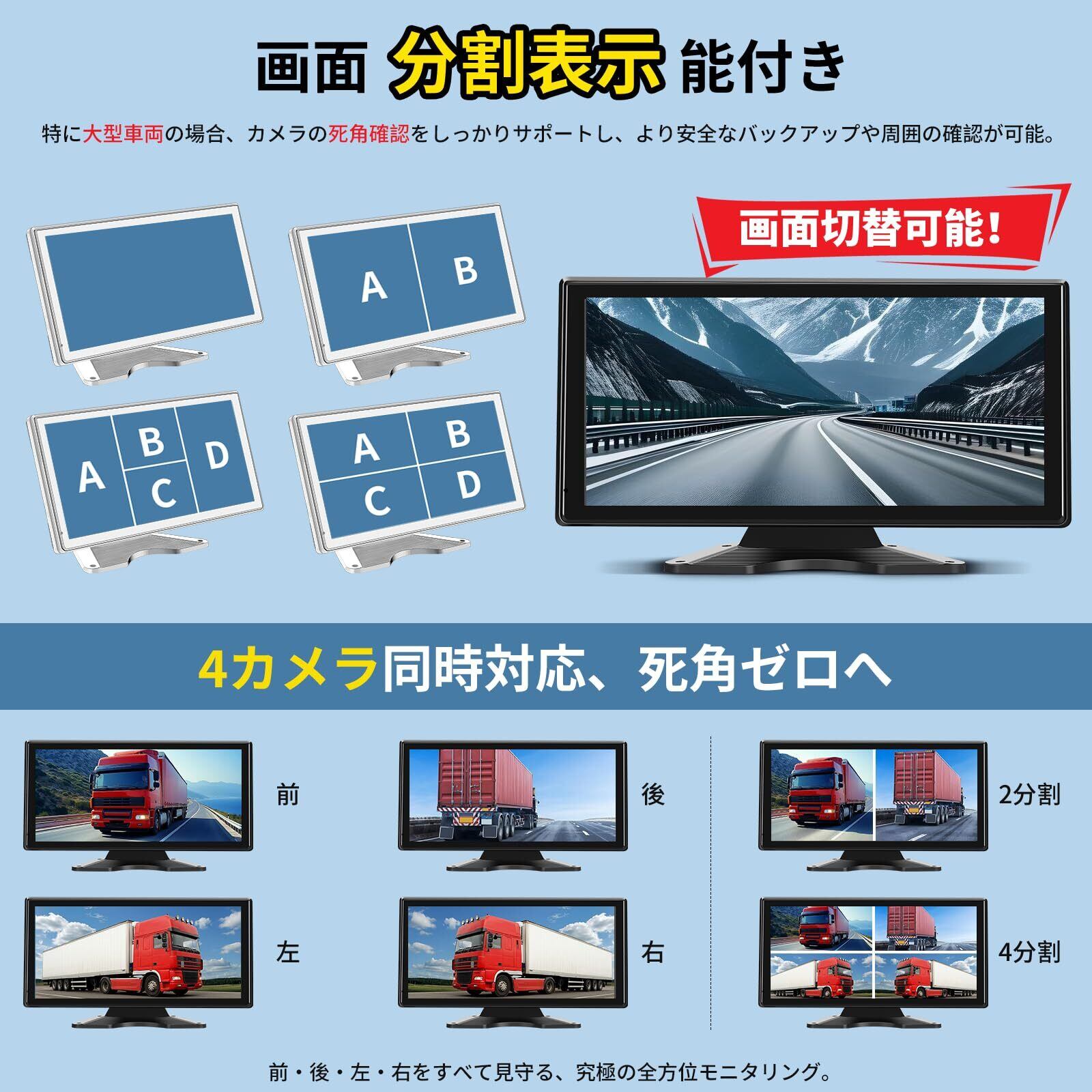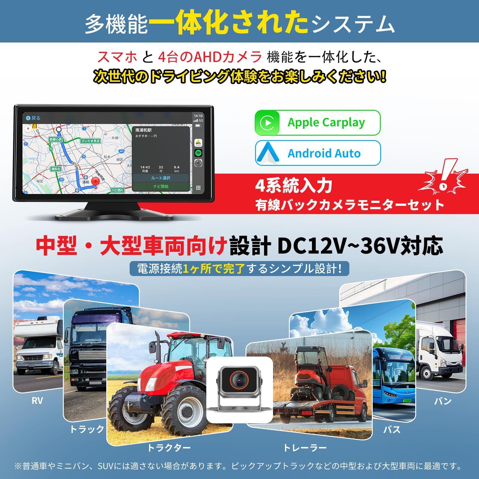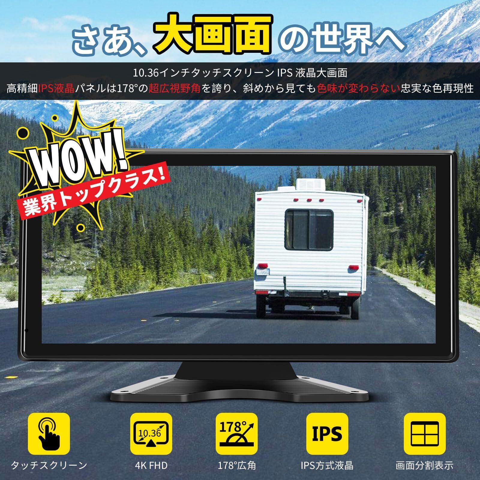 10.36インチバックカメラモニターセット Carplay/Android Auto対応 ワイドバックモニター カーナビ ドラレコ 一体化 AHDカメラ4台搭載 暗視機能 4系統入力 タッチスクリーン ループ録画/正像鏡像/画面分割 ガイドライン微調整 12/24Vトラック 大型車用 有線式 日本説明書付き 2年メーカー