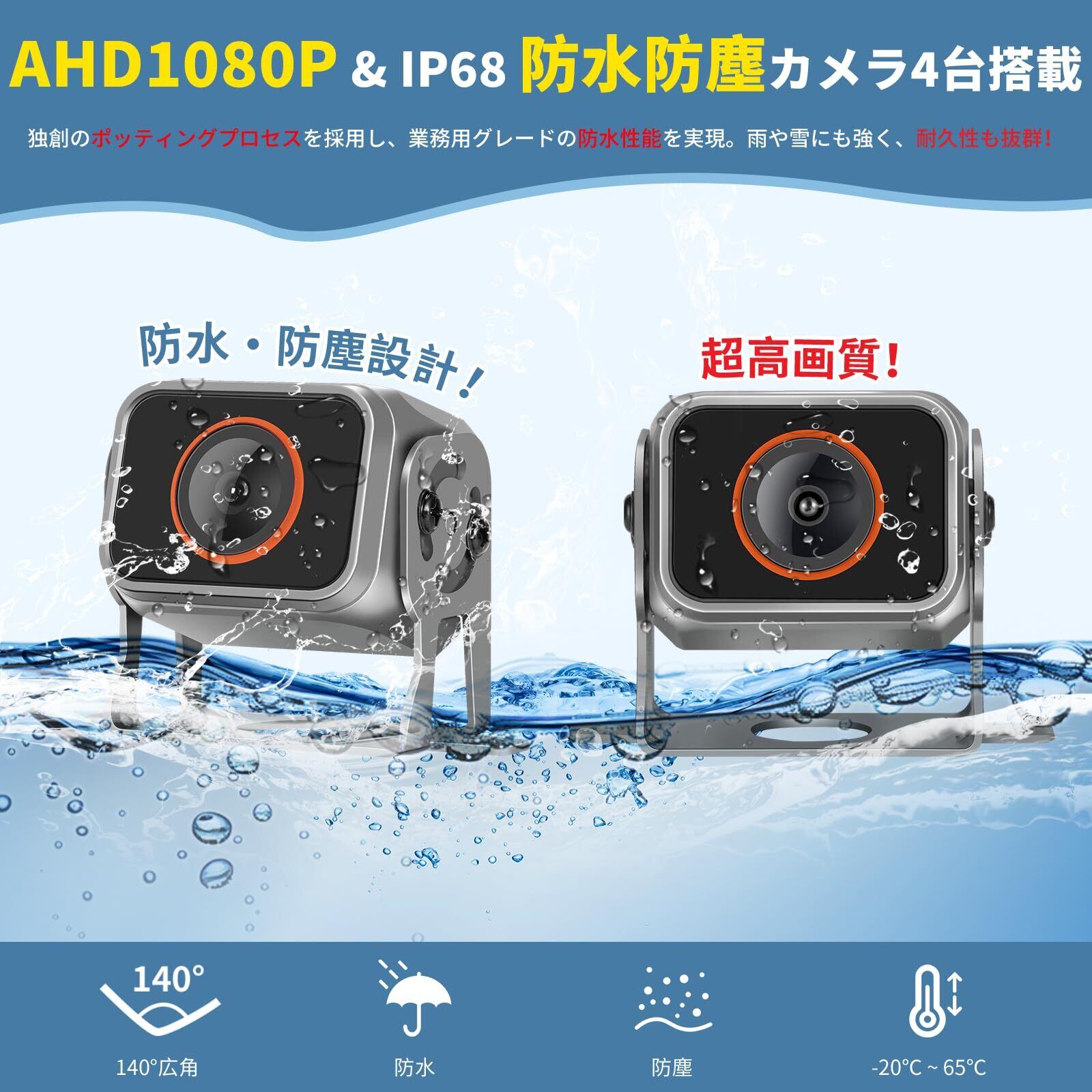 【4台AHD高画質防水カメラを標準付属&同時接続可能】本製品には最初から4台の高性能AHDカメラを同梱。全天候対応の防水・防塵設計で、雨や雪などの悪天候でも安定した鮮明な映像を提供します。高感度センサーを採用しており、昼夜問わず高画質な撮影が可能。車両の前後左右をしっかりカバーし、死角を最小限に抑えます。荷物管理や運行中の安全監視にも最適で、大型車両に欠かせない安心感を実現します。
