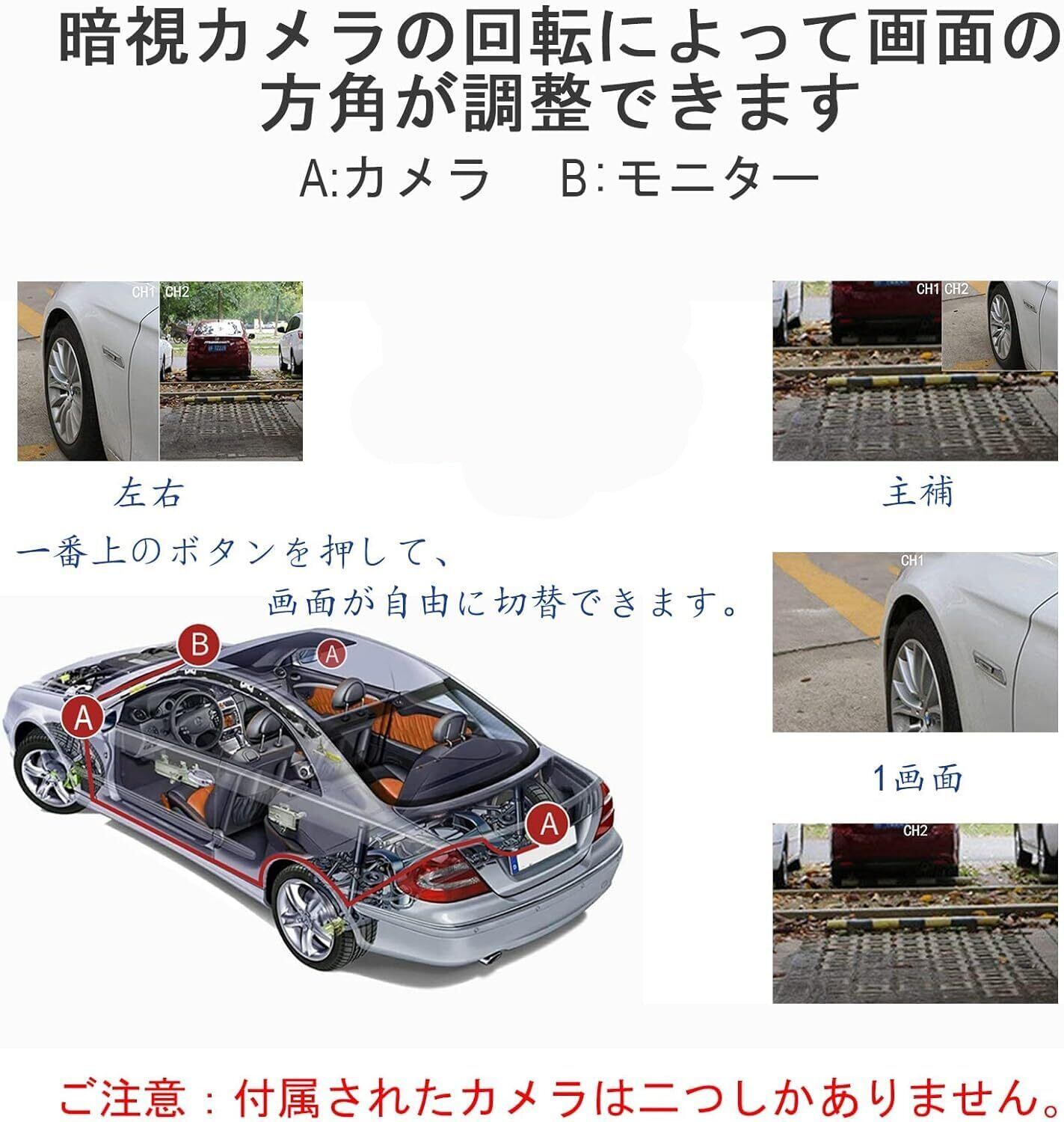 【安全運転をサポート】一つのモニターに二個カメラの映像を同時確認することができます。ボタンを使って任意のカメラの画像を呼び出すことができます。モニターに前と左/右、後ろと左/右または左と右の死角を映し、車周りの情報を把握することで、より安全に運転することができます。右左折時の巻き込みの防止や駐車時の周囲の確認にも役立ちます。