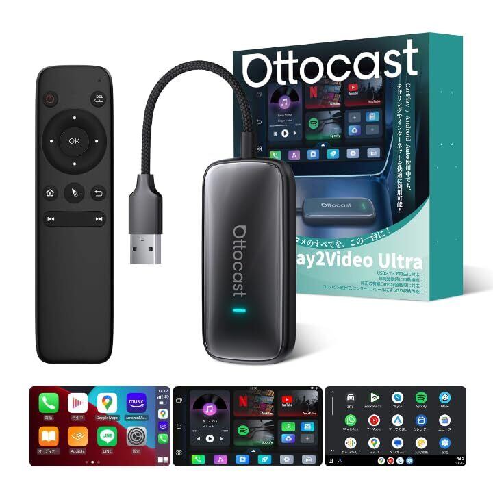 オットキャスト Ottocast Play2Video Ultra + リモコン付き セット Ottostar 2025新型 人気アプリPrime Video・YouTube・TVer・Netflixが視聴可能 ワイヤレスCarPlay/Android Auto対応 多機能ai box 2016年以降の純正で有線のカープレイ搭載車に対応(リモコンセット)
