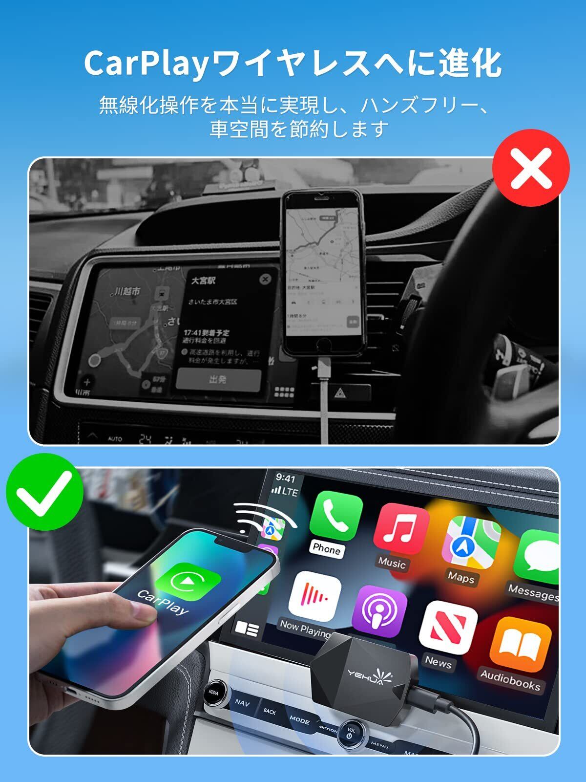 ワイヤレス CarPlay アダプター YEHUA 無線カープレイワイヤレス ディスプレイアダプター無線化ドングル純正な有線CarPlay搭載車専用 Yahoo!カーナビタイム Googleマップ/音楽/Siri/通話/メッセージ受送信 USB C to A交換ケーブル付き 600車種以上適用(iPhoneだけ対応)
