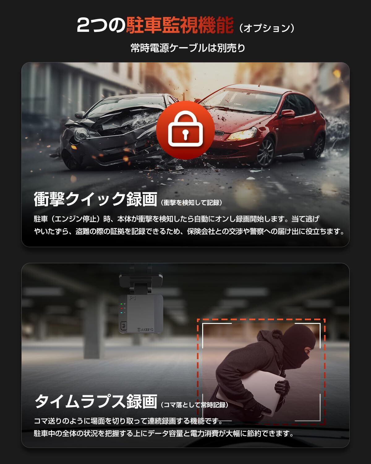 【常時録画・Gセンサー録画・駐車監視モード・タイムラプス撮影】・常時録画:エンジンONからOFFまでの映像を常時に録画します。microSDカードの常時録画フォルダの容量がいっぱいになると古いデータから上書きして録画を続けます。車に乗る度に手動スタートの手間をかけず、記録忘れを防げます。・緊急録画:ぶつかりや急ブレーキなど車に一定以上の衝撃を受けた際に、前後45秒間を録画します。常時録画中のデータと別ファイルとして保存されるため、当て逃げや出会い頭などの被害にあった時に重要な証拠となります。OP:駐車監視モード 専用の指定品のケーブル(B0DNMBH2CZを検索してください)を併せて使用する事で、駐車監視モードを起動させる事が出来ます。1秒に2フレームのタイムラプス撮影で最長24時間監視し、映像の記録を行います。