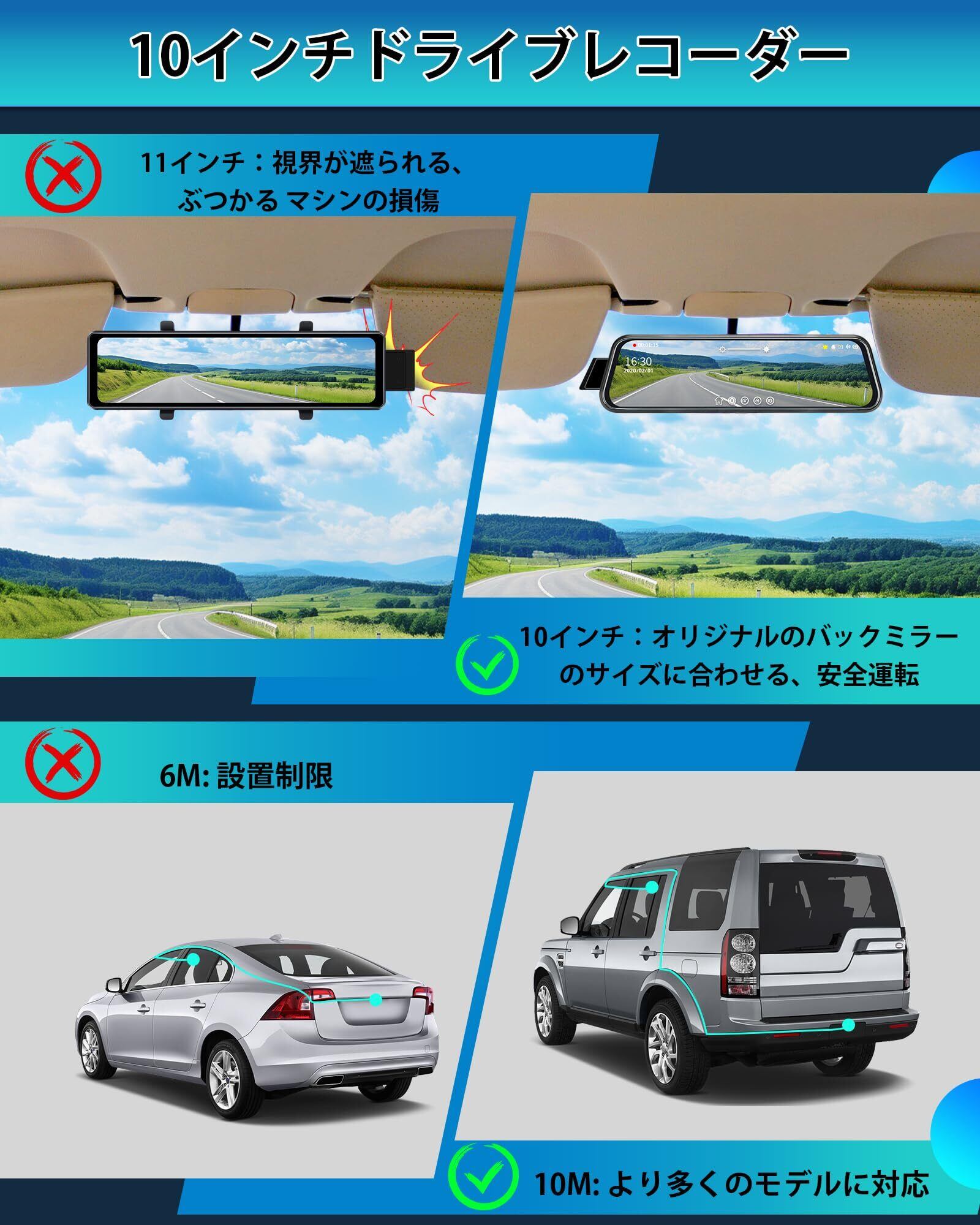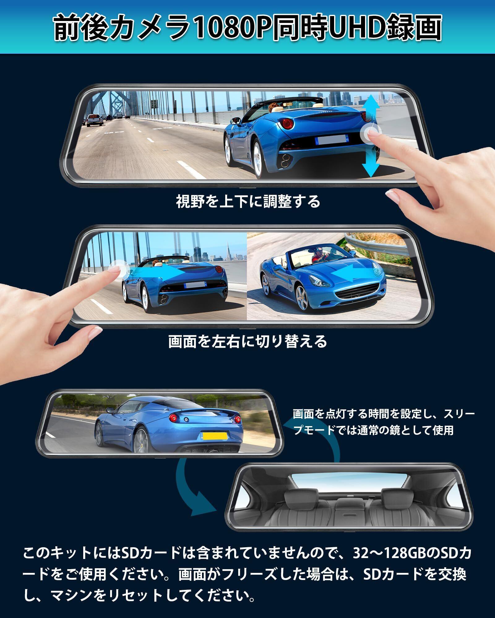 【10インチ黒ガラススクリーン】新バージョンのJansiteミラー型ドライブレコーダースクリーンは、最新のブラックガラススクリーンを採用し、効果的に光を吸収・散乱させ、反射や映り込みを低減します。 ドライバーの安全性を向上させます。10インチのミラー型ドライブレコーダーの最高互換性を持ち、元の車のバックミラーのサイズに非常にマッチし、インストールは突然ではありません。IPS LCDタッチパネルにより、ミラー型ドラレコのタッチがより反応しやすくなり、操作がより便利になり、タイムラグ現象が減少します。モニター画面をタッチ&スライドして、画像の角度、明るさ、表示画面などの設定を調整できます。