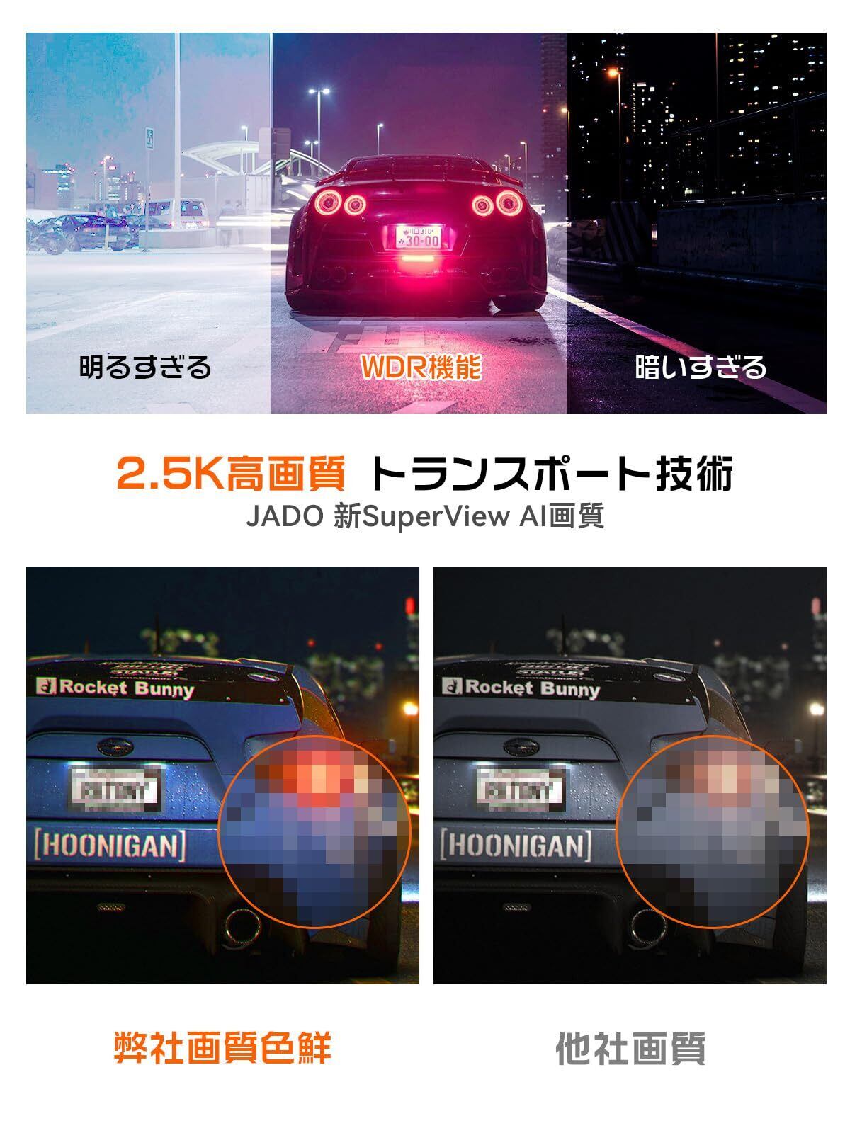 【自動カラーパディング技術+暗視機能WDR/HDRドラレコ】 より高コストな部品による画質と伝送の向上、最新のAIスマートカラーパディング技術の搭載により、最終的には満足できる画質に向上し、WDR/HDRの眩しい光を低減せずに自動調整することで、通常の2.5Kフロントカメラよりも30%ほど鮮やかな色味を実現しました。 夜の照明がそれほど悪くない場合でも、色の鮮やかさは15%以上アップできます バックカメラにはWDRで眩しい光抑制機能がありますので、フロントカメラよりも暗くなりますが、正常な状態でご心配しないでください。注:実際の白光抑制効果は、夜の明るさや後続車の近さが影響しますので、詳細は説明書の末をご参照ください。