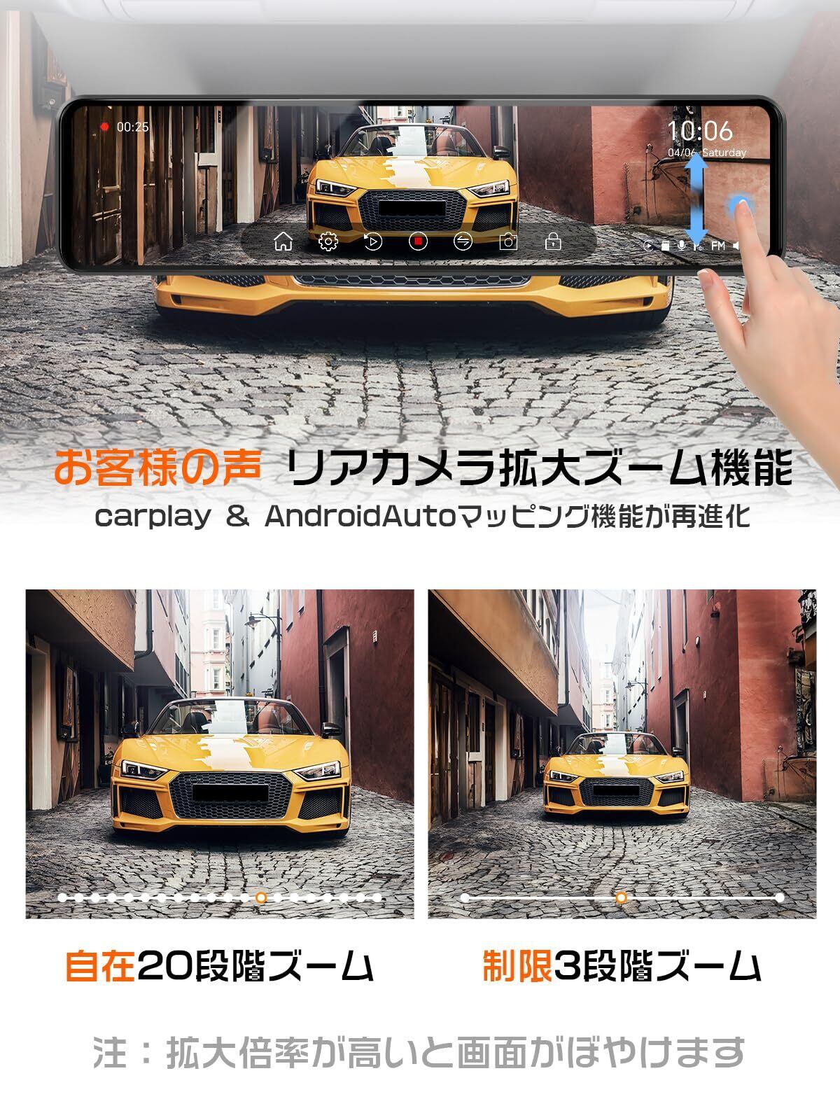 【自由度を高めた20段階ズーム拡大機能】お客様からのフィードバックやコンテンツをもとに、CPUなどをアップグレードし、従来のズーム機能では対応できなかった画面の拡大率を自由に調整できるようになりました。 2倍まで、20段階の超微細な比率調整。注: ズーム機能を使用すると、画像がぼやけたり、広角領域が縮小したりすることがあります。当社はお客様の製品体験を非常に重視しており、最後の「製品に関する質問」で貴重なご意見やご提案をお待ちしております。注:商品の性能が高く、電力供給の要求が高いため、運転時の高温は正常です。本体は無電池搭載のデザインで、安全リスクはありません。車の純シガーソケットを使用してください、増設ヒューズ電源ソケットと3連ソケットは使用しません、給電が不安定になると、電源が落ちてディスプレイが不良になることがあります。商品に付属している説明書を詳しくお読みください。