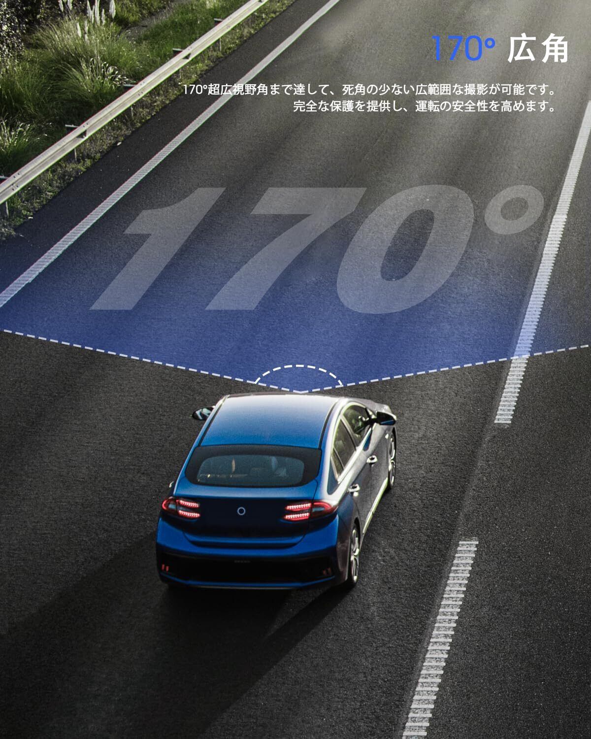 【常時録画・Gセンサー・24時間駐車監視】本車内用レコーダーは、電源が入れると録画が開始して、古いファイルに自動的に上書きしながら録画をするので、メモリ不足は心配不要。高感度のGセンサーが内蔵されて、運転中でも駐車中でも衝撃を検知すると、現在の動画は自動にロックされて緊急録画ファイルに保存されて上書きされないです。それに、タイムラプス映像撮影と動体検知という2つのモードで駐車監視機能を実現して、車内防犯カメラとして活躍して、24時間365日愛車の安全を守ります。①タイムラプス録画:エンジンOFFの駐車中でも周囲の状況を定期的に撮影して、タイムラプス映像としてまとめます。②動体検知:車カメラの視野内で動きが検出されると、30秒のビデオ録画を開始します。(このビデオはロックされず、通常録画フォルダに保存されます。モーション検知の録画中にGセンサーによる衝突が検出される場合、このビデオはロックされ、緊急録画フォルダに保存されて上書き削除されないです。)ご注意:24時間駐車監視機能は、専用のType-C付きのACC降圧ケーブル(ACC、BATT、GND)が必要です。入手は、ご連絡ください。