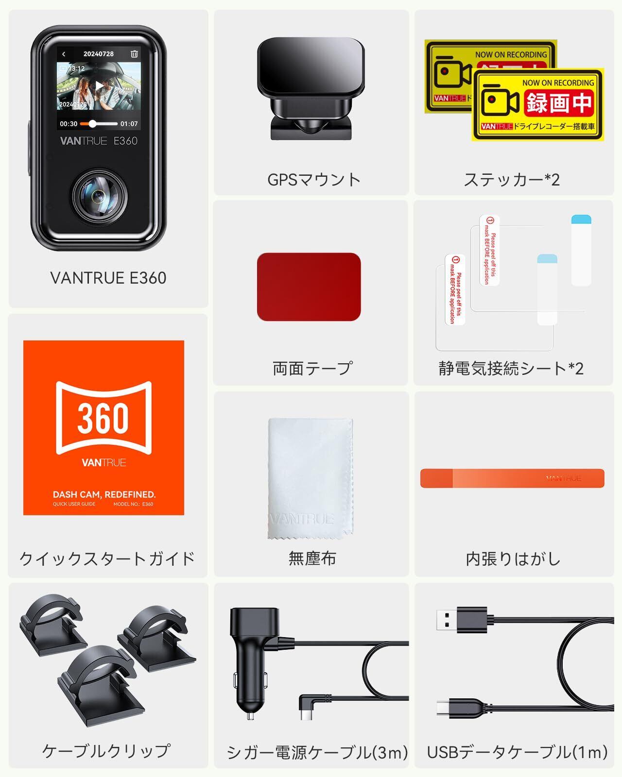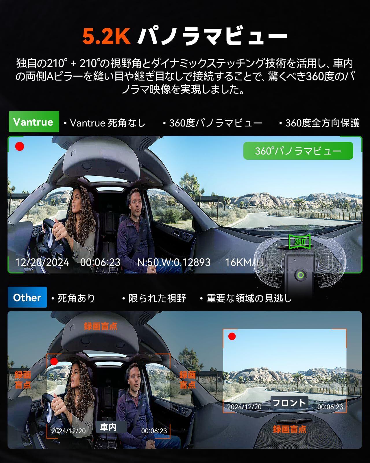 360度 ドライブレコーダー VANTRUE E360 5.2K ドラレコ 前後カメラ 210°+210°全周囲録画 STARVIS 2超強暗視機能 前後HDR パノラマビュー 全方向撮影 一体型 魚眼レンズ 車載カメラ スマホ連携 赤外線機能 前後 タッチパネル式 WiFi搭載 日本語音声コマンド GPS機能内蔵 24時間駐車監視 ノイズ対策済 全国LED信号機対策