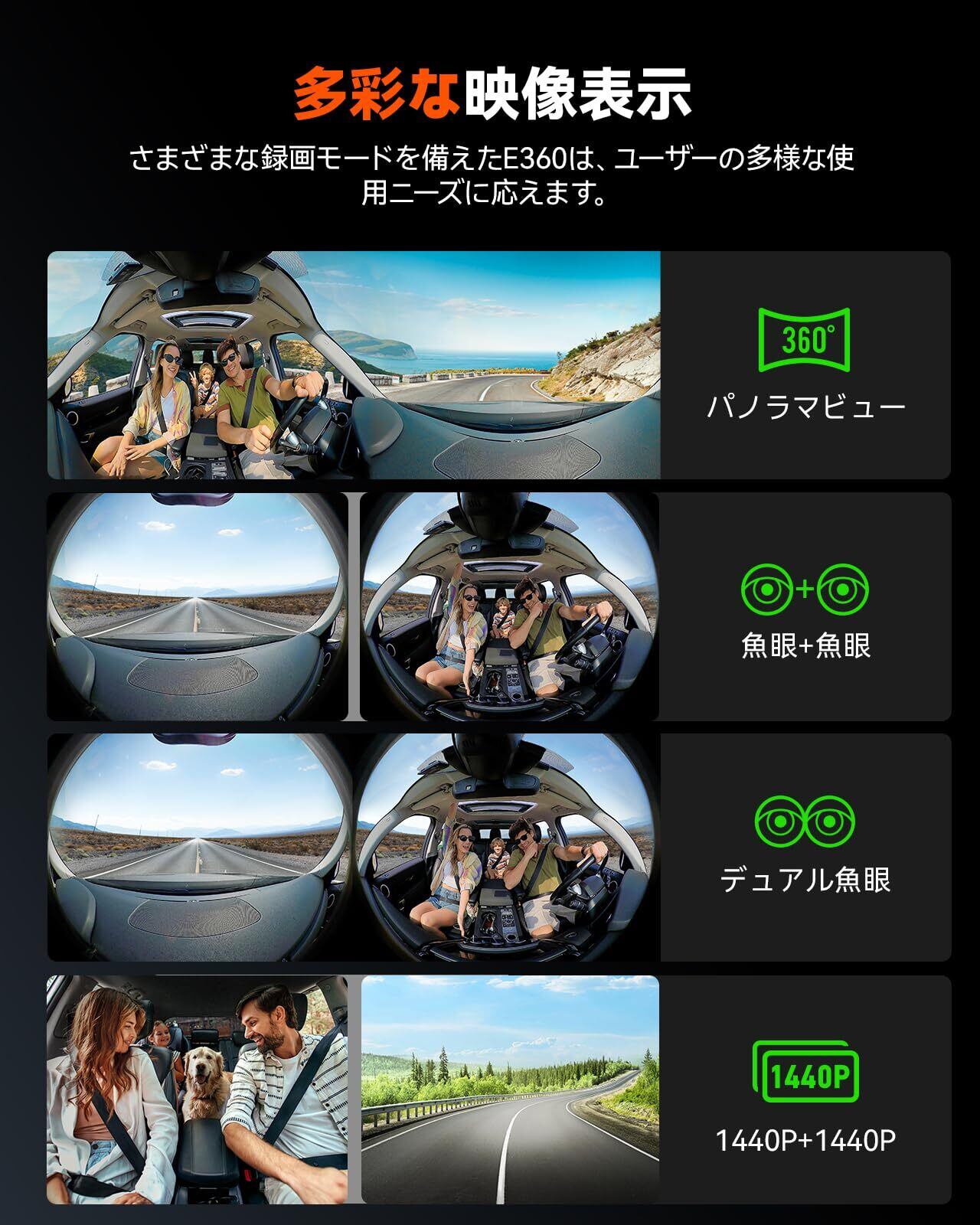 【業界初 全チャンネル360°カバー!】驚愕の360°パノラマドライブレコーダー、VANTRUE E360が登場しました!この革新なドラレコは、最高5.2Kの解像度で前方と車内の映像を鮮明に融合し、重要な瞬間を逃しません。前方210度、車内210度の大光圈広角レンズを搭載し、従来の3カメラモデルより150%広い視野で、死角なく全方位をしっかり捉えます。また、パノラマビュー、魚眼+魚眼、デュアル魚眼、1944P+1944Pなど、さまざまな録画モードを備えたE360は、ユーザーの多様なニーズに応えます。
