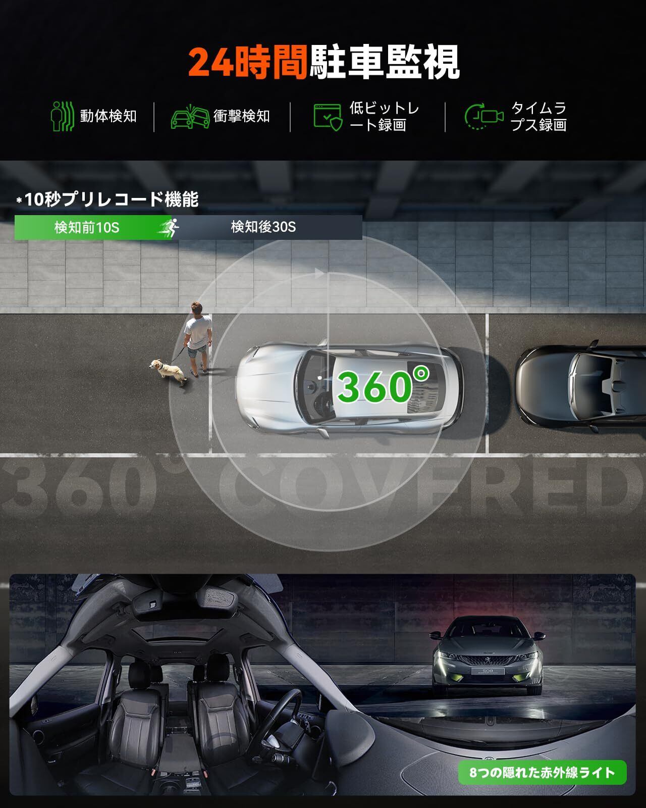 360度パノラマ, 5.2K高画質, STARVIS 2超強暗視機能, 前後HDR, 24時間駐車監視, 前後4つの赤外線ライト付き, 魚眼レンズ, GPS内蔵, 衝撃検知, G-s… 表示を増やす