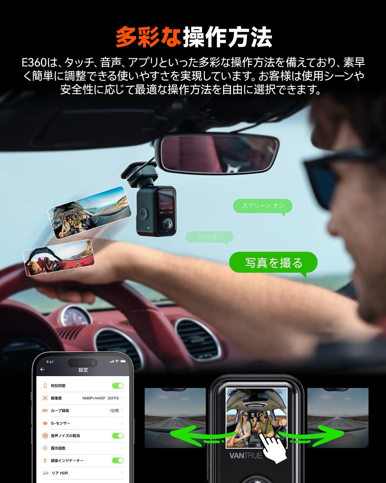 【多彩な操作方法:タッチ、音声、WiFi接続】E360は、タッチ操作、音声コントロール、専用アプリを備え、設定の調整を迅速かつ簡単に行えます。直感的なタッチパネルと音声指示により、手を使わずに設定を変更可能です。さらに、5.8G WiFi機能によって、スマートフォンでリアルタイムのプレビューや動画再生、ダウンロードが簡単に行えます。E360はユーザーのニーズに応じた柔軟な設計で、快適なドライブ体験を提供します。状況に応じて最適な操作方法を選べるため、運転中も安心してご利用いただけます。