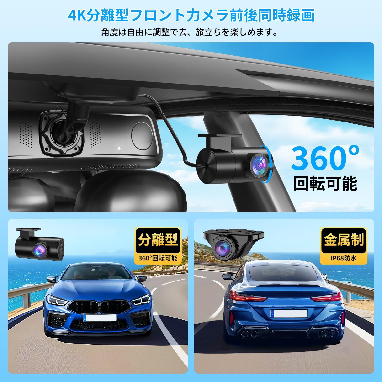【分離式カメラ設計のセパレート式ドライブレコーダー 前後】①スモークガラス対応力向上高輝度ソニー製IMX415センサーを搭載し、色付きガラスの影響を抑え、暗い車内でも明るく鮮明な映像をしっかりと捉えます。②バック駐車をサポート(リバース連動)、ガイドライン調整対応。③ドラレコは、大口径F1.8と高透過率8層レンズ、さらに170°の広視野角を搭載しており、ナンバープレートや看板の文字、周囲の状況まで鮮明に捉えます。死角を減らし、あおり運転対策もばっちりです!HDR/WDR機能が進化し、明暗の差を完璧に再現。逆光時の白飛びや夜間でのノイズ感を軽減。【再進化・3軸Gセンサー(10段階調整可能)】3軸センサーで前後、左右、上下からの突然の車体の動きを検出します。