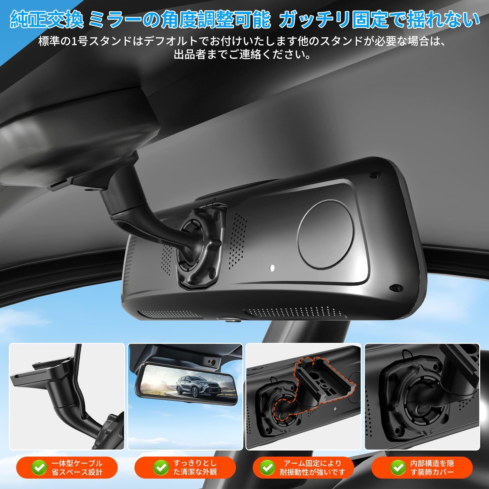 【日本純正ミラー交換型ドライブレコーダー】従来のガラス貼りタイプや、バックミラーの背面に大型マウントを装着する方式とは根本的に異なる、純正バックミラーと完全置換型のドライブレコーダーです。日本の人気車種を徹底分析し、独自開発した専用マウントを採用。標準装備の「タイプ1」マウントは、国内主要車種の90%以上に対応しています。さらに、N-BOX/スペーシア/ハスラー/ジムニーなど、人気モデル向けの専用マウントも別途ご用意。純正部品と同様の取り付け方式により、従来品の弱点であった「走行時の揺れ」を完全解消。常に安定した映像記録を実現します。※ご使用の車種に適合しない場合は、お気軽にカスタマーサポートまでご連絡ください。該当車種用マウントへと対応させていただきます。
