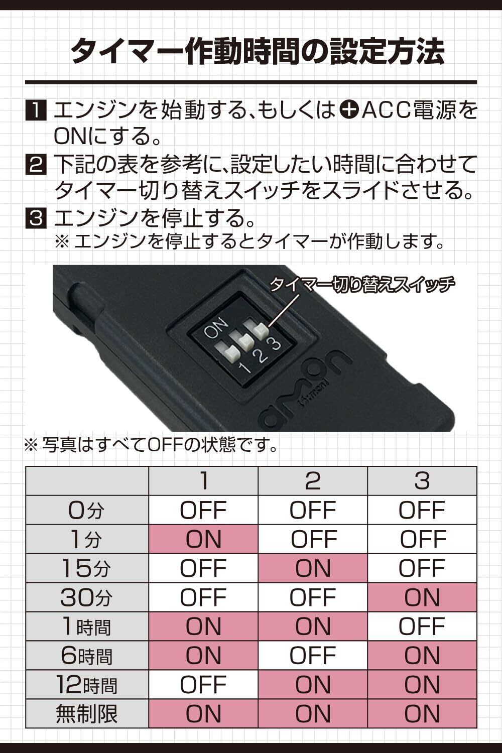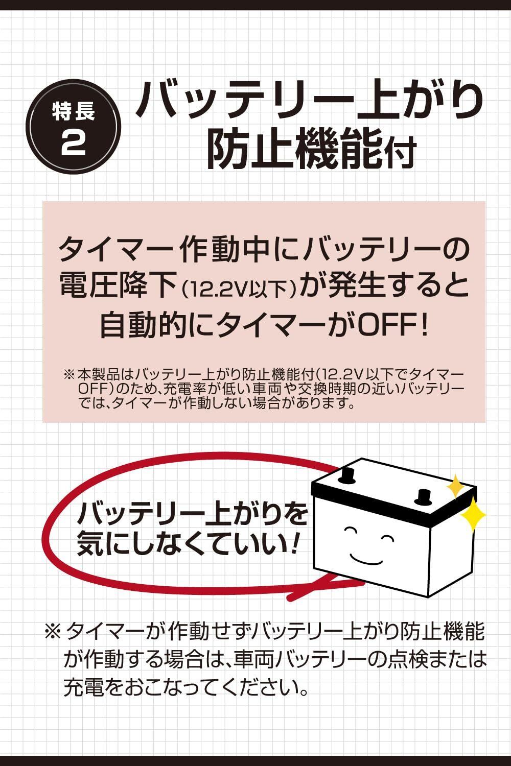◆バッテリー上がり防止機能付。タイマー作動中にバッテリーの電圧降下(12.2V以下)が発生すると自動的にタイマーがOFF。※タイマーが作動せずバッテリー上がり防止機能が発生する場合は、車両のバッテリーの点検または充電をおこなってください。