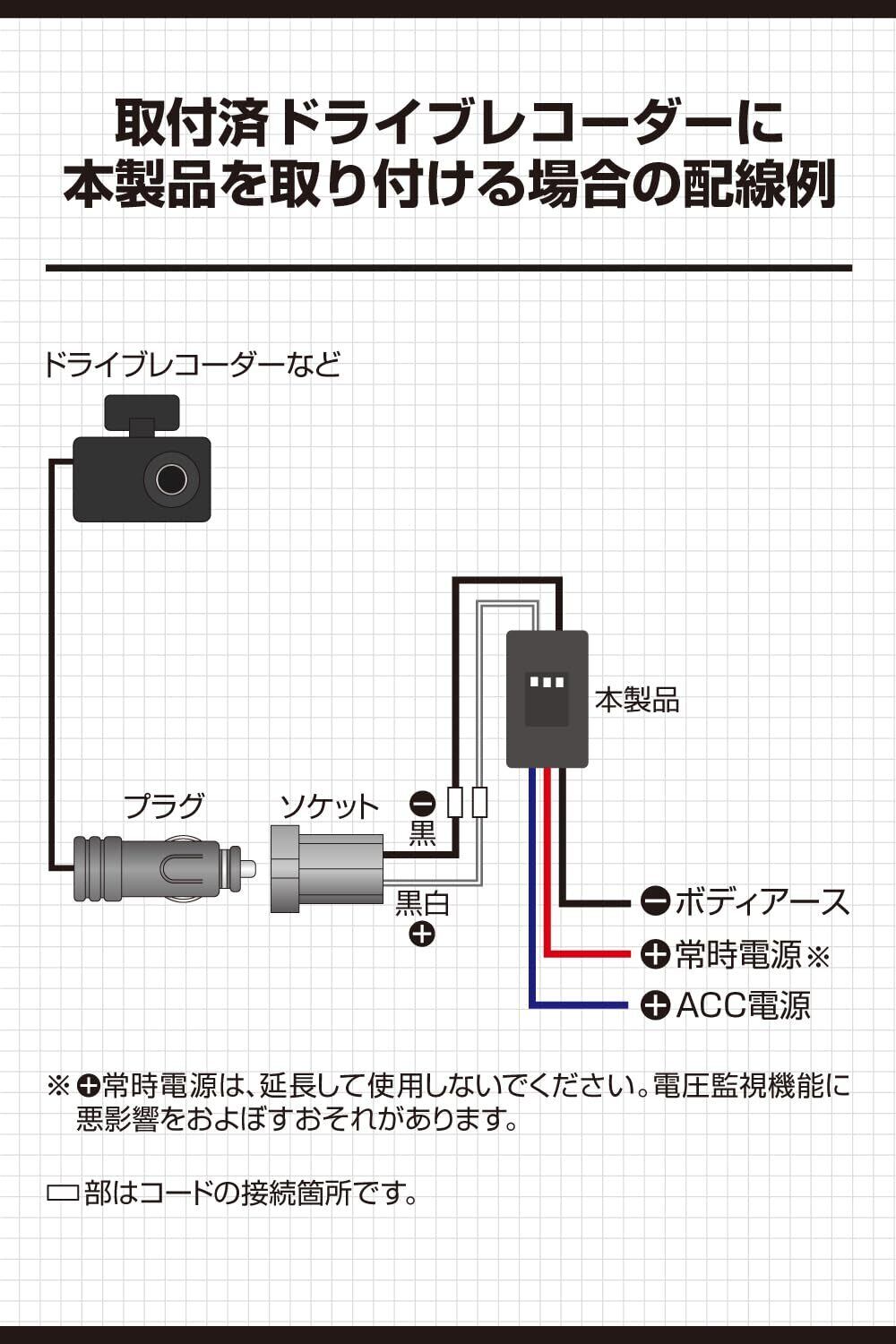 ◆バッテリーに負担がかかるため本製品を複数個取り付ける場合、電装品の合計消費電流が3Aを超えないように使用してください。