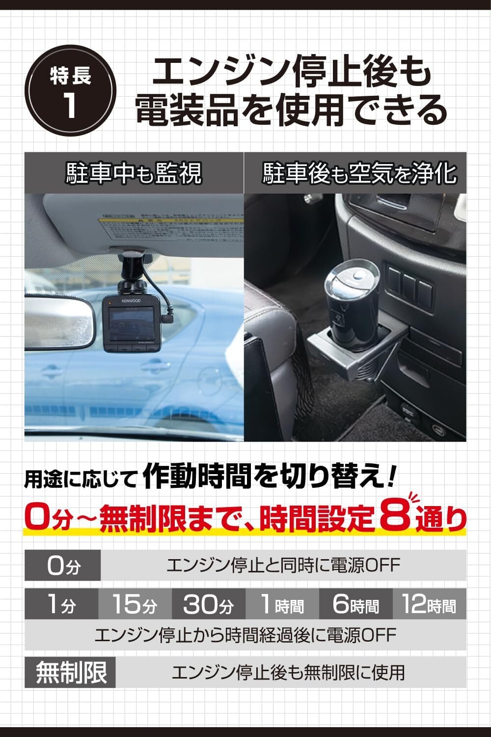 ◆用途に応じて作動時間を切り替え。0分~無制限まで、時間設定8通り。・駐車中も監視できる(駐車監視機能付ドライブレコーダー)。・駐車後も空気を浄化できる(空気清浄機)。
