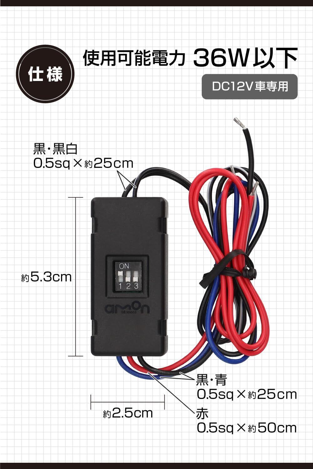 使用可能電力:36W以下(DC12V車専用)、使用可能電圧:10~15V、出力可能電圧(電流):12V(3A)、コード:AWG20、太さ0.5sq相当、長さ:ダブルコード黒白/黒:250mm 黒/青:250mm 赤:500mm、タイマー設定時間:0,1min,15min,30min,1h,6h,12h,無制限の8通り