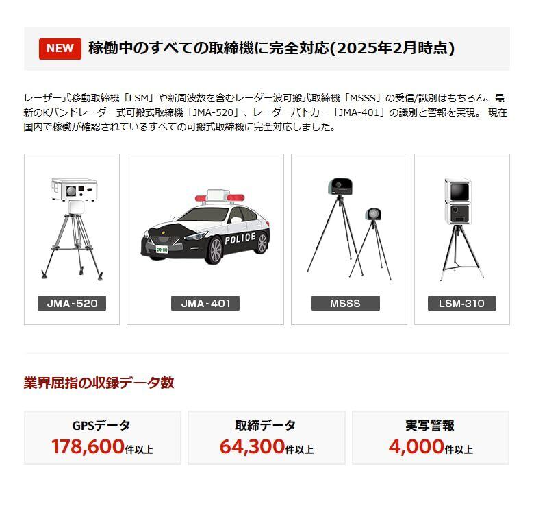 無線制御周波数 レーダー波可搬式オービス「MSSS」、レーザー式移動オービス「LSM」、Kバンドレーダー式可搬式オービス「JMA-520」、レーダーパトカー「JMA-401」