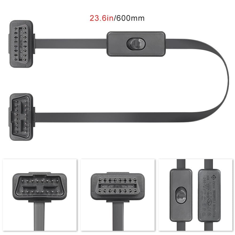 OBD2 スイッチ付き 延長フラットケーブル 延長コード 16ピン 長さ60cm 車両診断 超薄型 取り回しを簡単に ケーブルの延長/電源の 耐高温 スイッチ付き 延長コード 車両診断延長ケーブル/電源まOBD2延長ケーブル