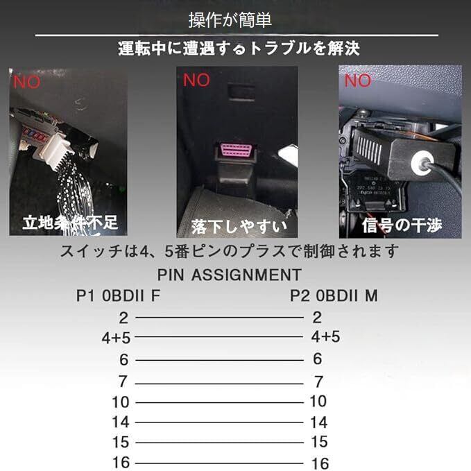 長さ:約60cm。スイッチ付きの為、OBD機器の電源のON,OFFが可能となります。より安全に使用できます。結線PIN 2, 4, 5, 6, 7, 10, 14, 15, 16 (OBD規格で定められているピン)