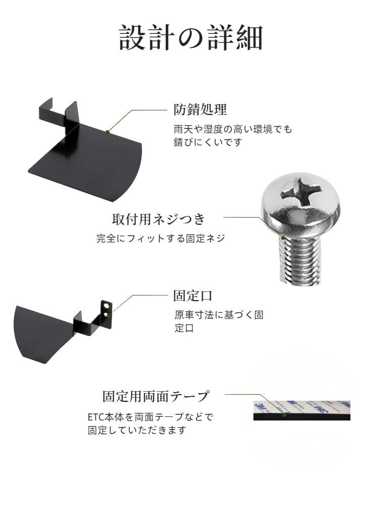 【商品詳細】ETC固定ブラケット1セット:ETC固定ブラケット1、ETC固定用両面テープ1、取り付け用ネジ2本が同梱。取り付け説明書は付属しておりませんが、基本的な手順に従えば、簡単に設置可能です。