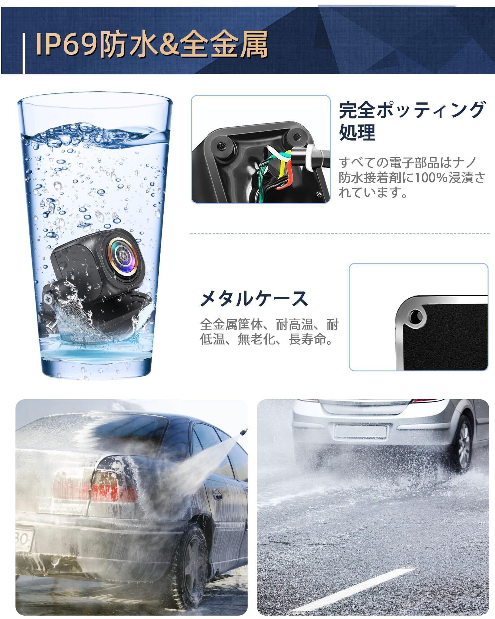 耐久性と取り付けやすさ---バックカメラ 車の防水等級はIP69Kです。フルメタルシェル、フルシールポッティングプロセスを採用し、工場出荷前に高圧防水テストと12時間パワーエージングテストを実施しています。暑さ寒さに関係なく、水の浸入や曇りを心配する必要がなく、長寿命です。ケーブル一体型の設計により、接続が簡単で、設置が容易になります。12-24Vバックボードをサポートし、ダブルアンチシールドケーブルは、熱を低減し、耐久性を向上させ、デジタルテレビや他の電子機器との干渉を避けることができます。