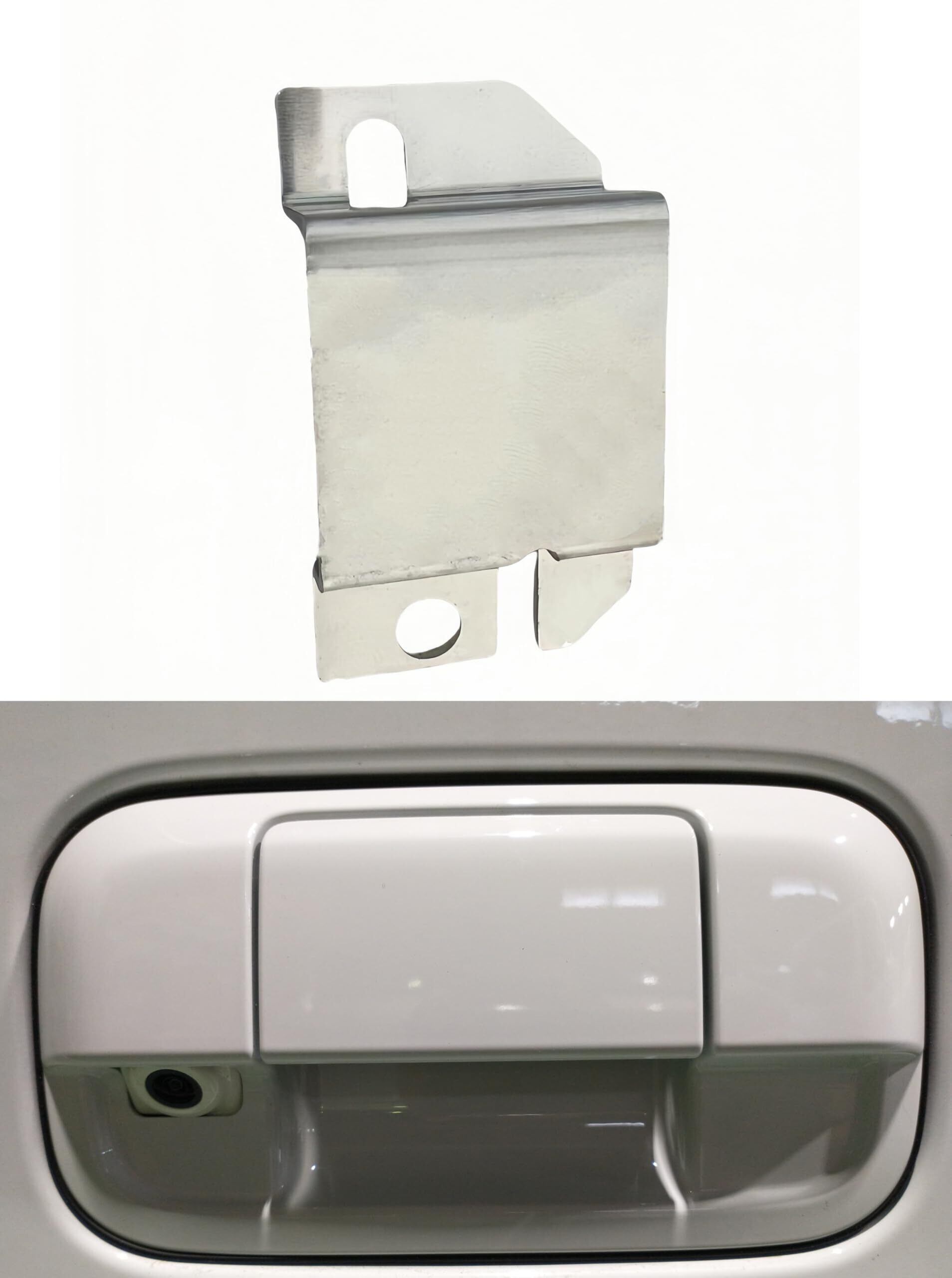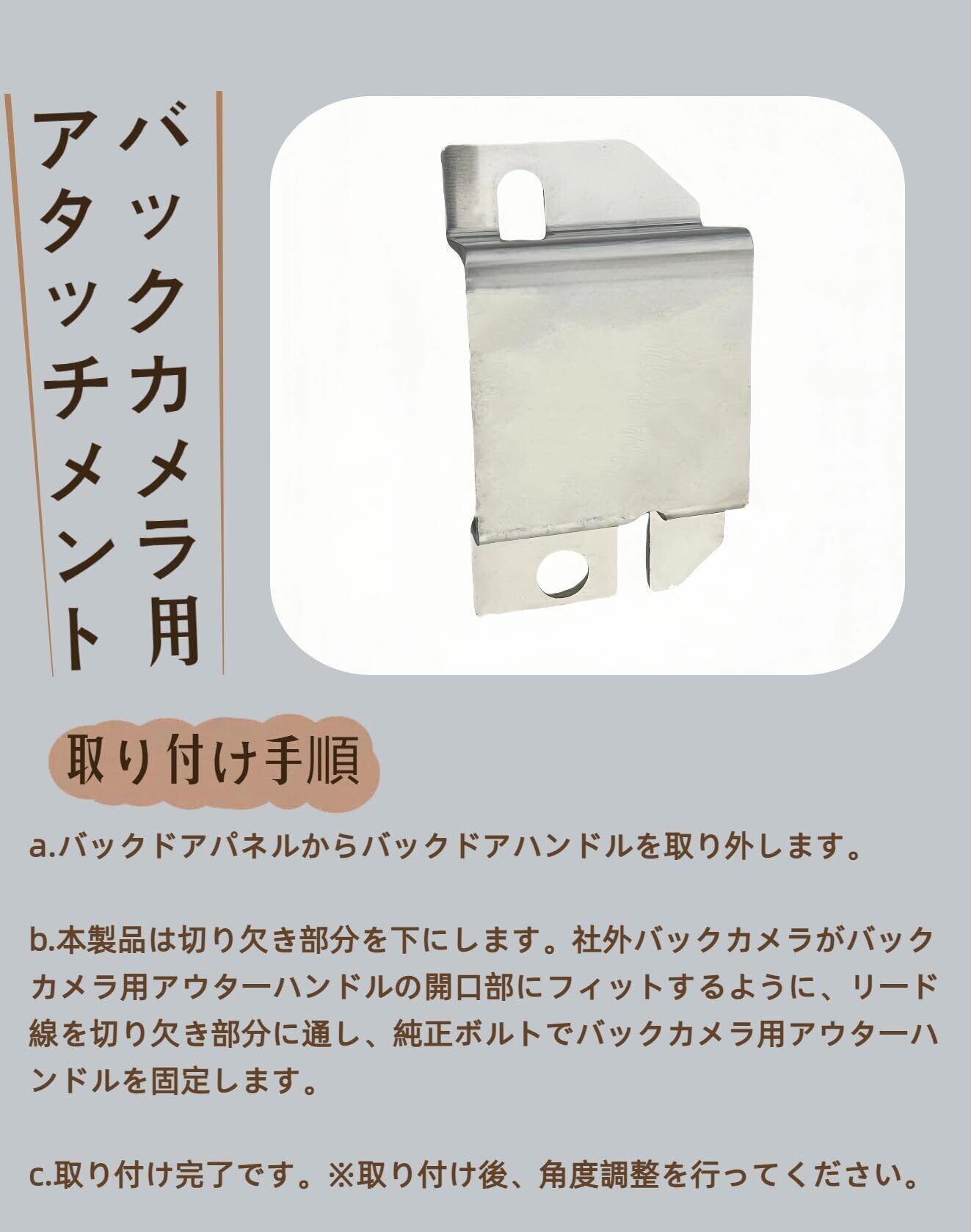 【取り付け手順】 a.バックドアパネルからバックドアハンドルを取り外します。 b.本製品は切り欠き部分を下にします。社外バックカメラがバックカメラ用アウターハンドルの開口部にフィットするように、リード線を切り欠き部分に通し、純正ボルトでバックカメラ用アウターハンドルを固定します。 c.取り付け完了です。※取り付け後、角度調整を行ってください。