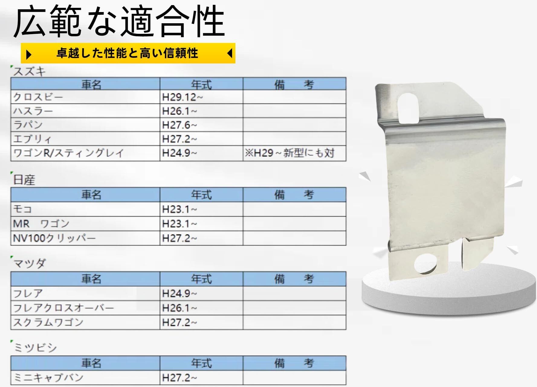 【取付可能車種】スズキ ハスラーH26.1〜、クロスビー XBEE 、ラパンH27.6〜、 エブリィH27.2〜、 ワゴンR/スティングレイH24.9〜(※H29新型にも対応) 日産 モコH23.1〜 MRワゴンH23.1〜 NV100クリッパーH27.2〜 マツダ フレアH24.9〜 フレアクロスオーバーH26.1〜 スクラムワゴンH27.2〜 ミツビシ ミニキャブバンH27.2〜 - 幅広い車種に対応可能です。